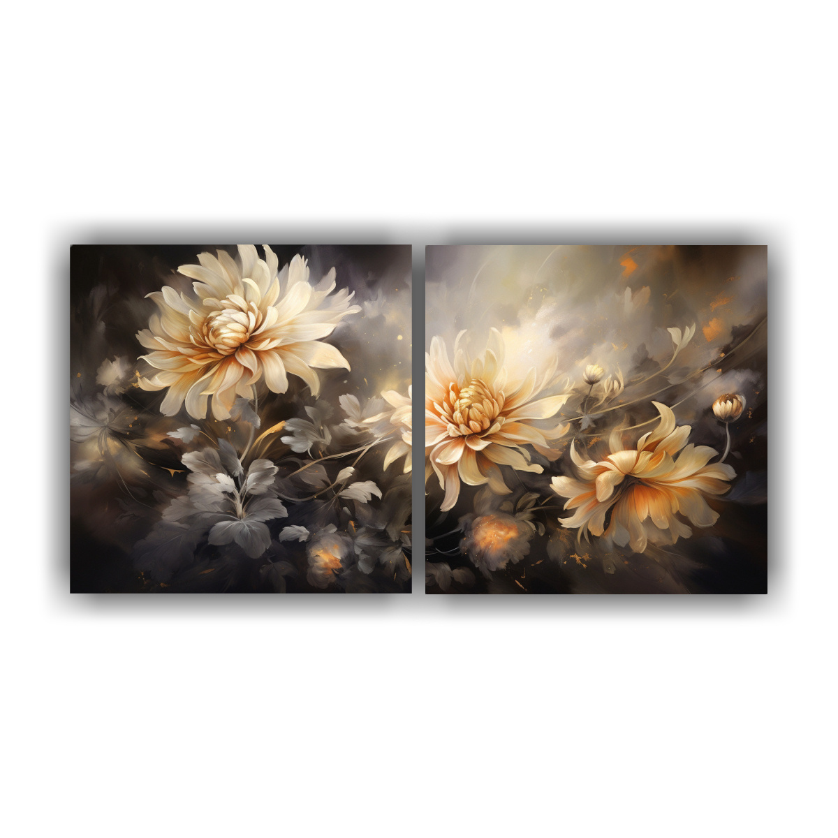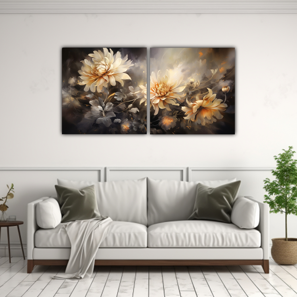 Pinturas Abstractas De Flores De Crisantemos En Colores Dorado Y Negro, Hermosa Belleza Natural De 2 Piezas.