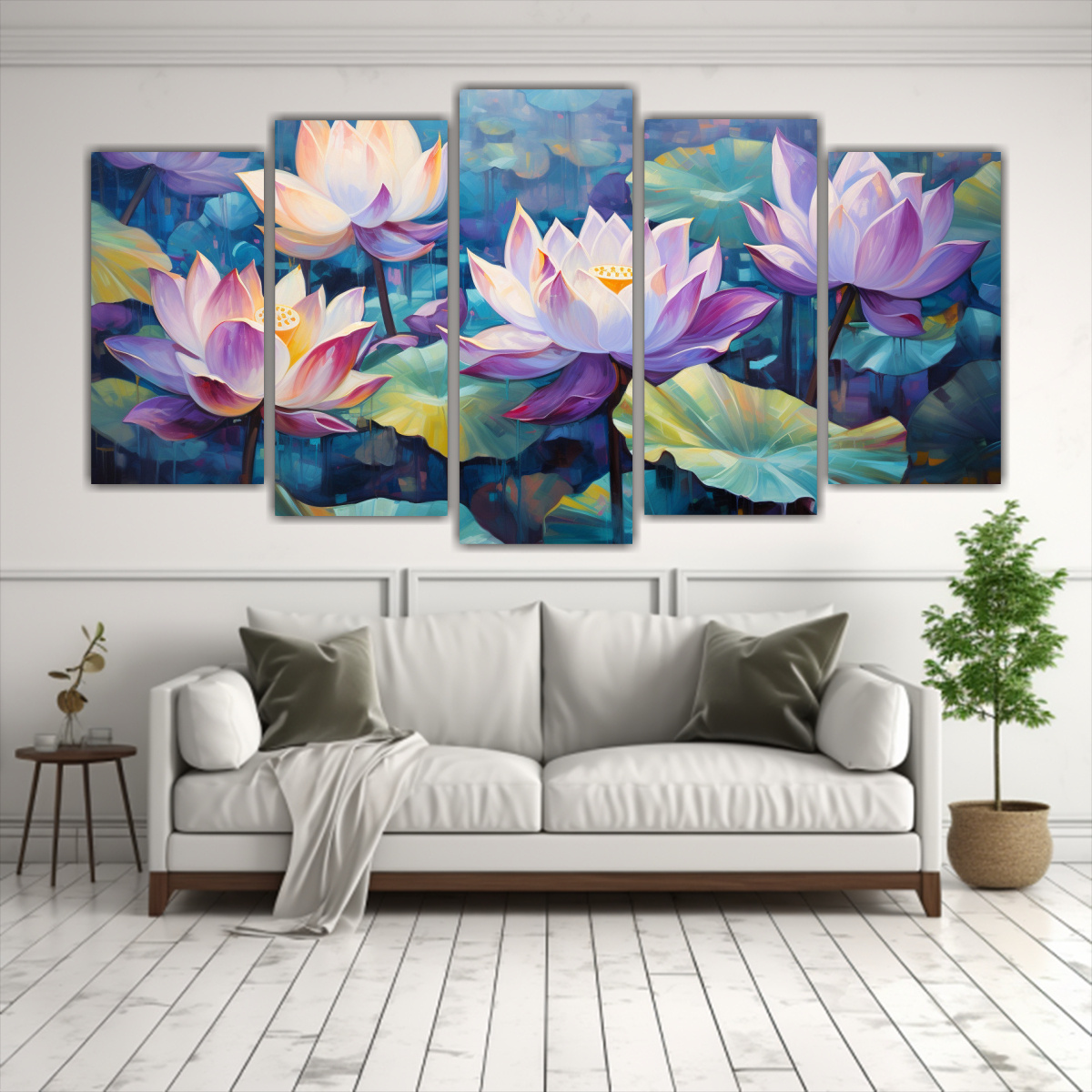 Este cuadro de pinturas abstractas de flores de loto púrpura y turquesa sería perfecto para decorar tu sala de estar Colócalo sobre un sofá gris claro para resaltar los tonos lila y menta del cuadro Complementa con cojines en tonos plateados y dorados y una alfombra en tonos carmesí y gris para darle un toque elegante y acogedor a tu espacio