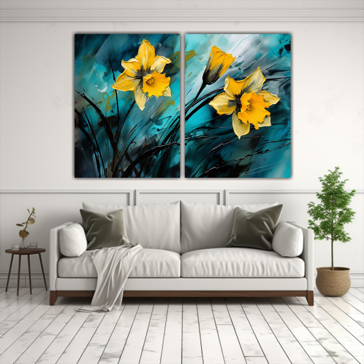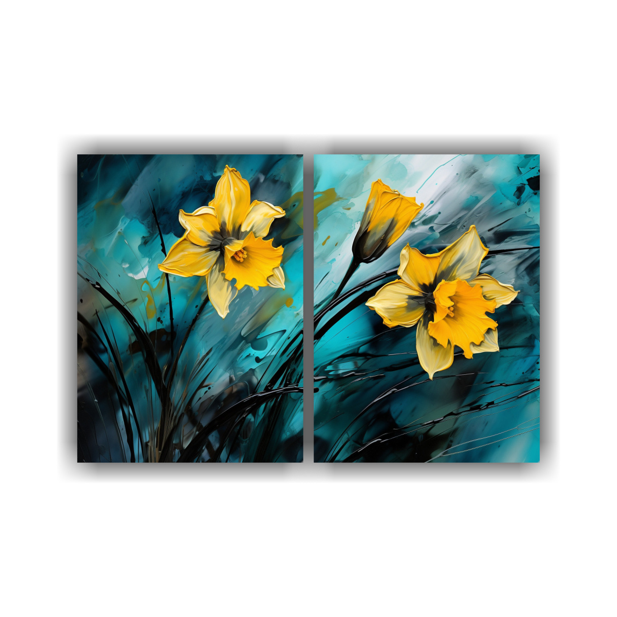 Las pinturas abstractas de flores narcisos en Turquesa y Negro ofrecen diseños exclusivos que destacarán en tu hogar Aprovecha nuestras entregas rápidas y gratuitas en Santiago, y envíos express a regiones para disfrutar de tu compra en poco tiempo