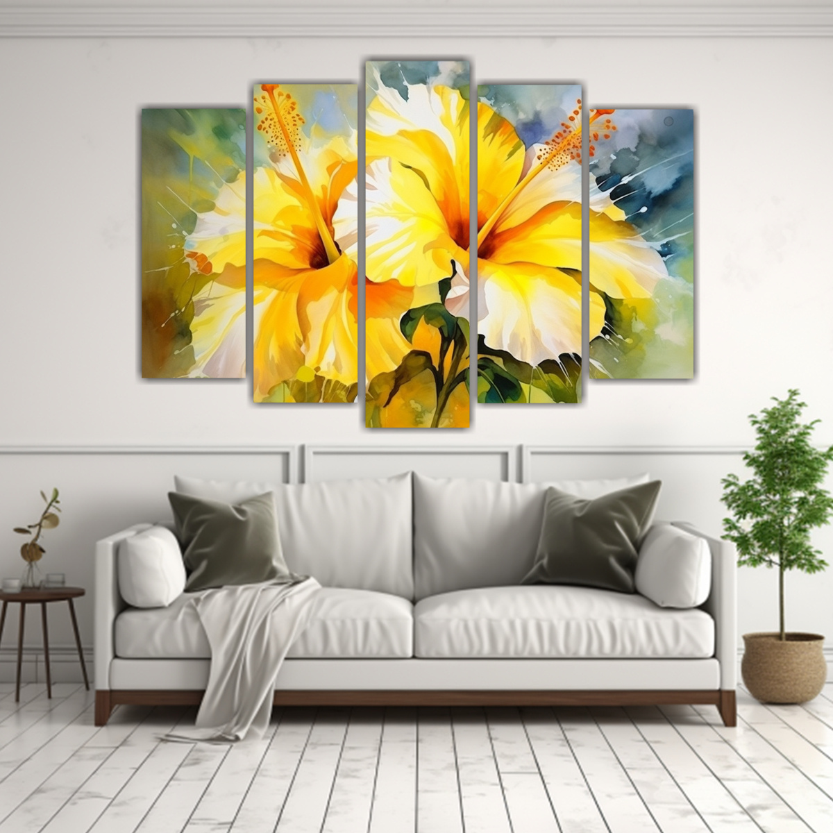 Pinturas Abstractas De Hibiscos Amarillos Y Blancos, Inspiradas En Simetría.