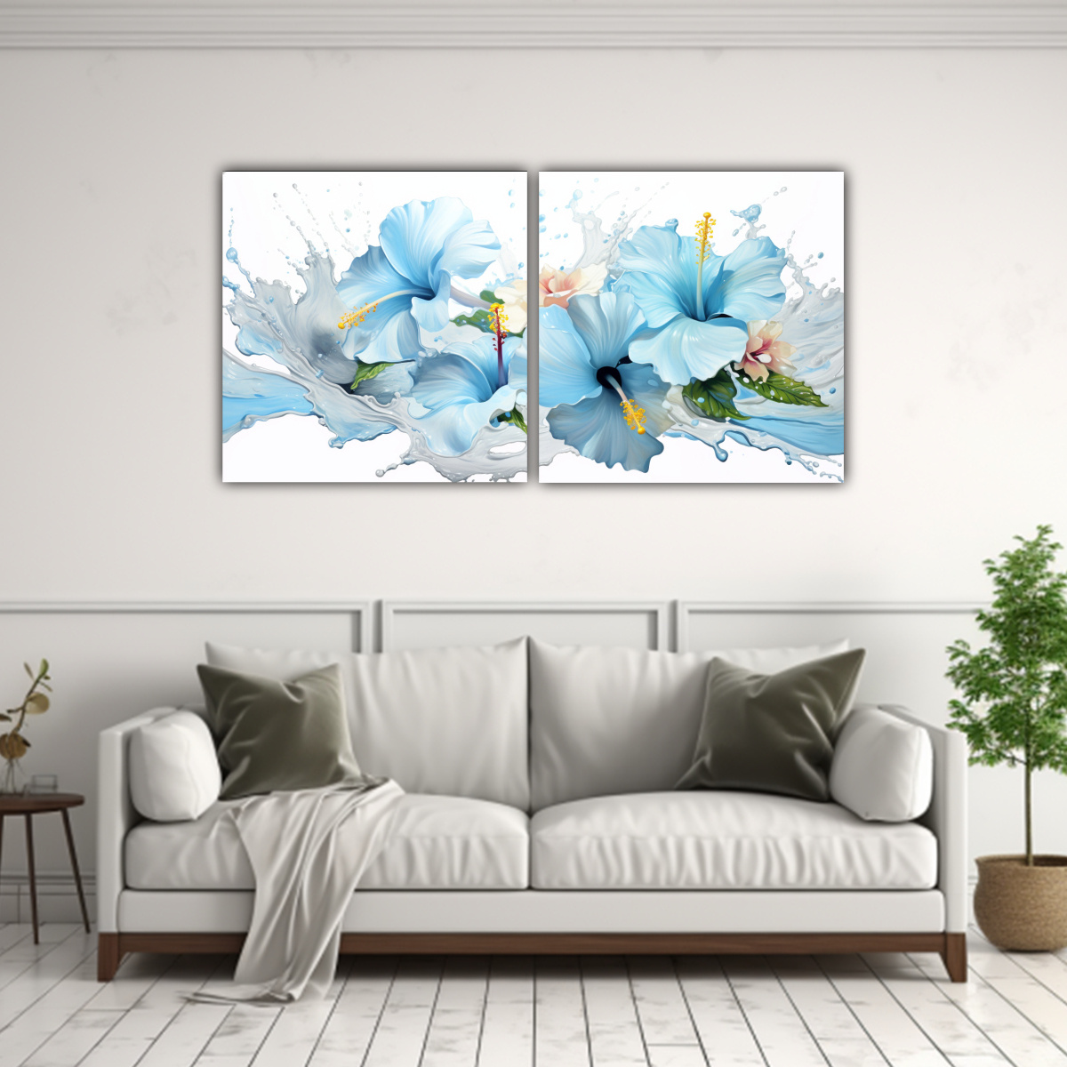 Este cuadro de hibiscos blanco y turquesa en bastidor sería ideal para colocar en tu sala de estar sobre un sofá gris claro, creando un contraste elegante y sofisticado Combínalo con cojines en tonos turquesa y beige para una decoración armoniosa