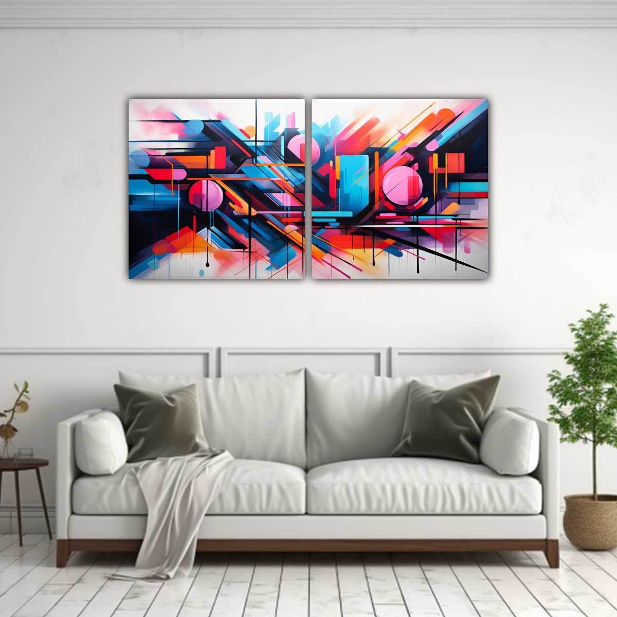 Este diptico de Figuras Abstract es perfecto para decorar tu sala de estar o tu dormitorio Combínalo con muebles de colores neutros como blanco o gris para resaltar su energía y estilo abstracto También puedes colocarlo en una pared de acento o en una galería de arte en tu hogar ¡Añade un toque de modernidad y sofisticación con este impresionante cuadro!