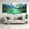 Este cuadro de montañas junto al lago en tonos verdes sería perfecto para colocar en el área de descanso de tu hogar, como el dormitorio o una sala de lectura Combínalo con elementos de decoración en tonos naturales y verás cómo transforma el espacio en un oasis de tranquilidad