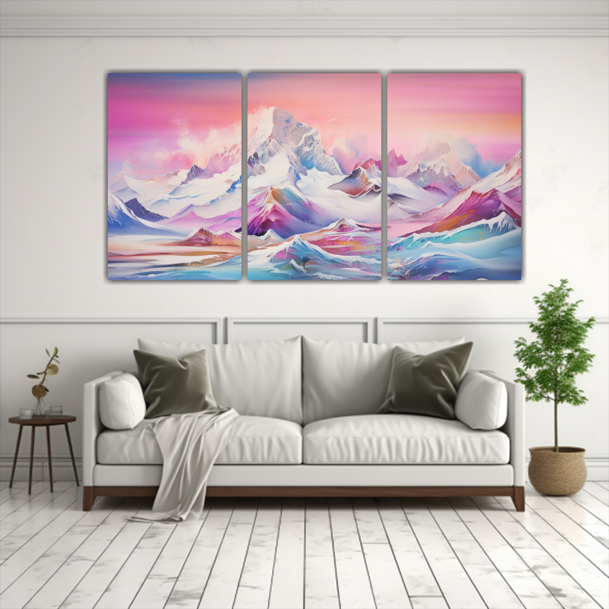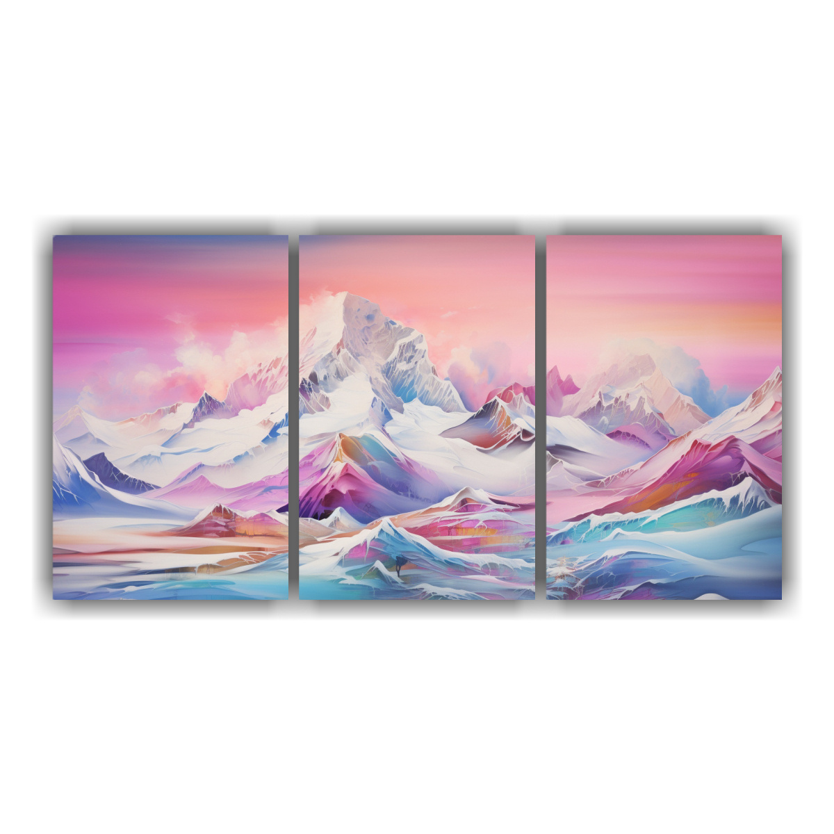 Este cuadro abstracto de montañas nevadas con arcoíris y colores rosa sería ideal para colocar en el área de descanso de tu hogar, como el dormitorio o un rincón de lectura Combínalo con muebles en tonos neutros para resaltar su belleza y crear un ambiente acogedor y moderno ¡Atrévete a darle vida a tus paredes con esta pieza única!