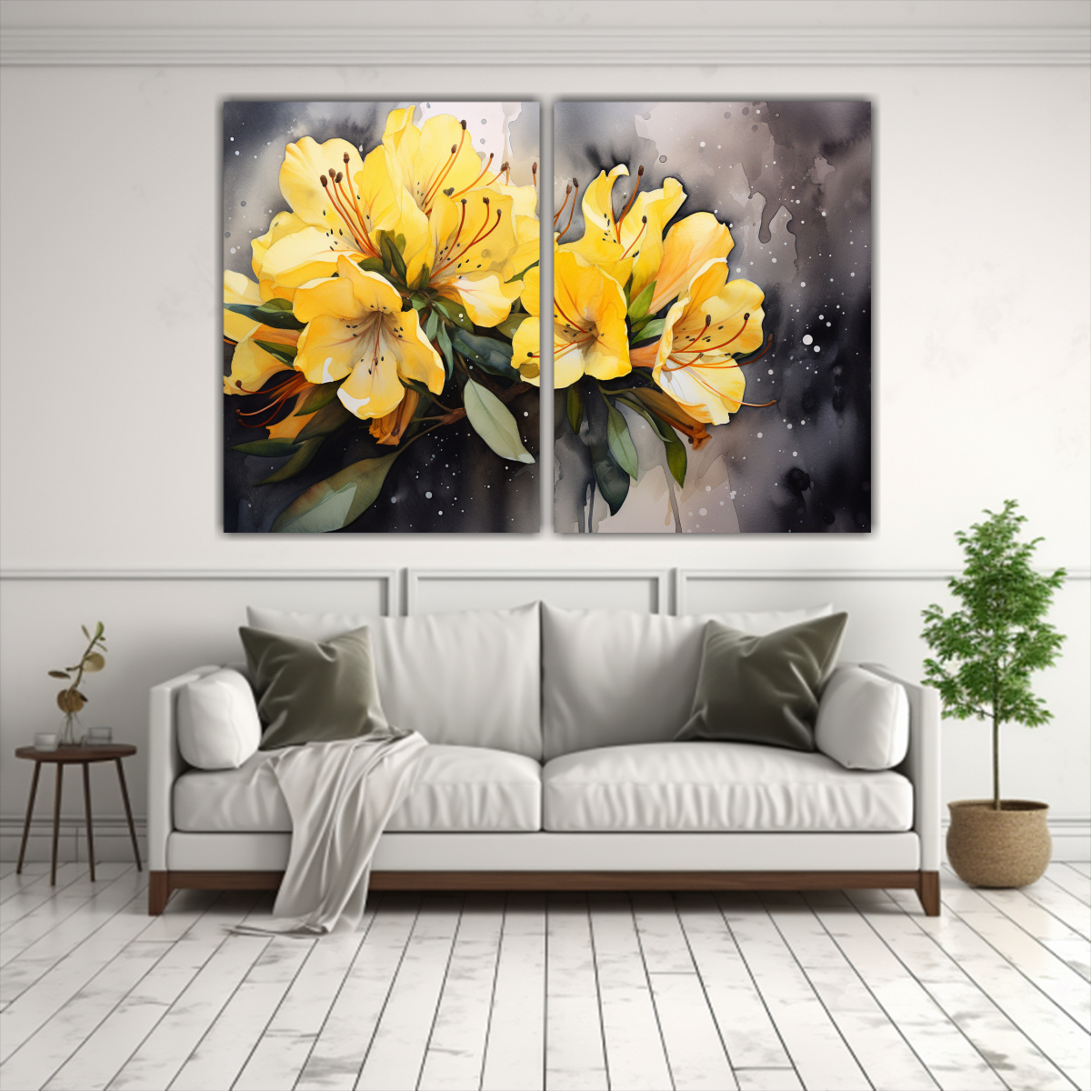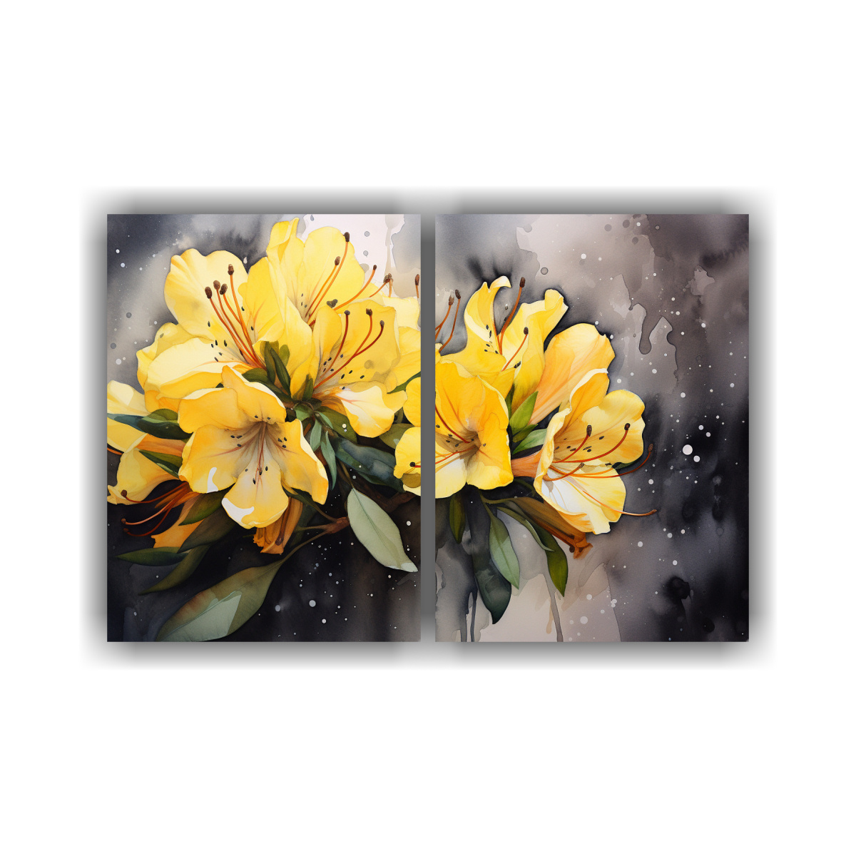 Este set de lienzos de rododendros amarillos y negros se vería espectacular en el área del comedor, creando un ambiente sofisticado y moderno Combínalo con muebles de tonos neutros para resaltar su belleza y darle un toque de color a la habitación