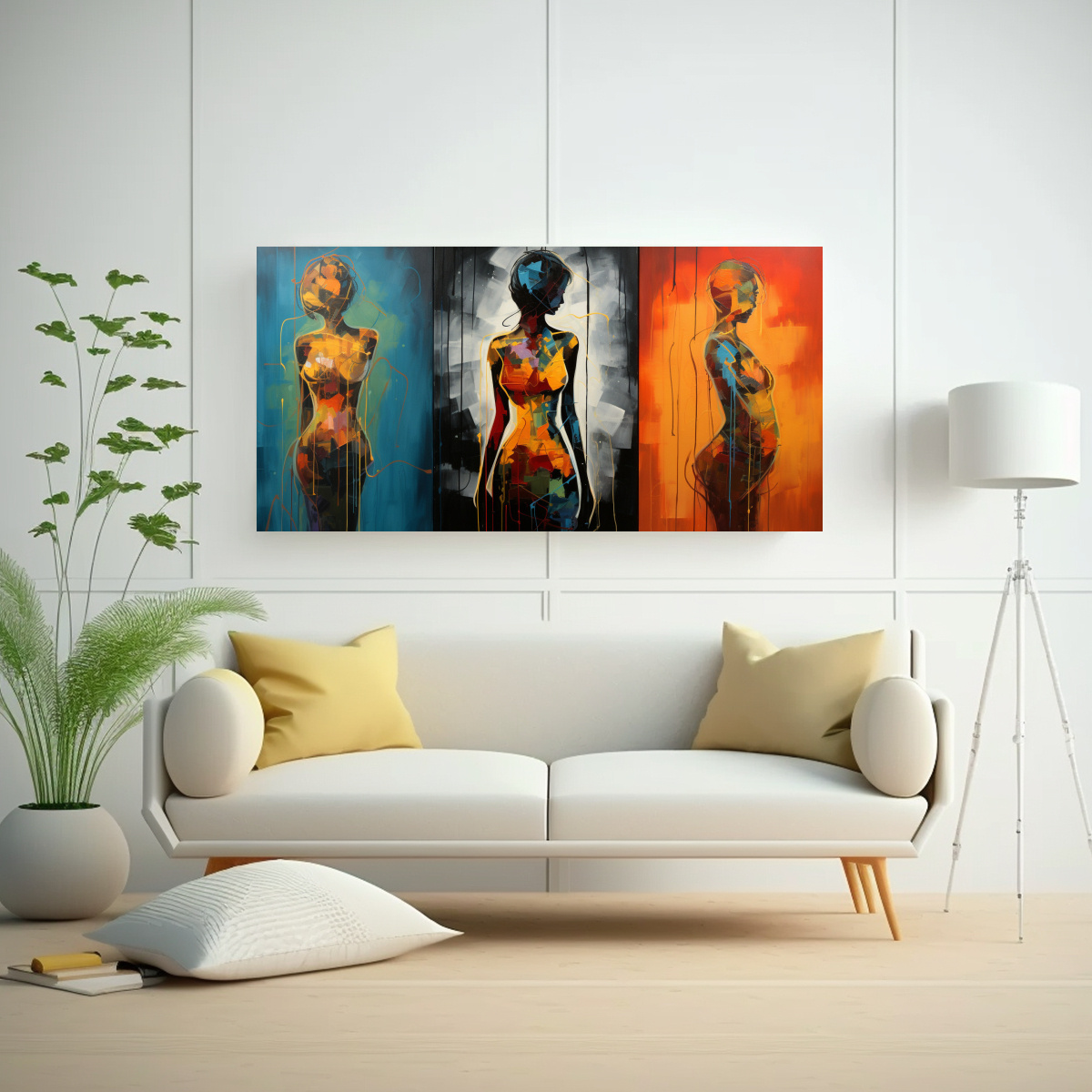 Coloca este cuadro abstracto de siluetas para inspirar en tu sala de estar para crear un ambiente relajante y elegante Combínalo con muebles en tonos neutros como el gris y el blanco, y agrega algunos elementos decorativos en tonos dorados para darle un toque de glamour ¡Crea un espacio único y lleno de estilo con este cuadro de DecoCuadros!