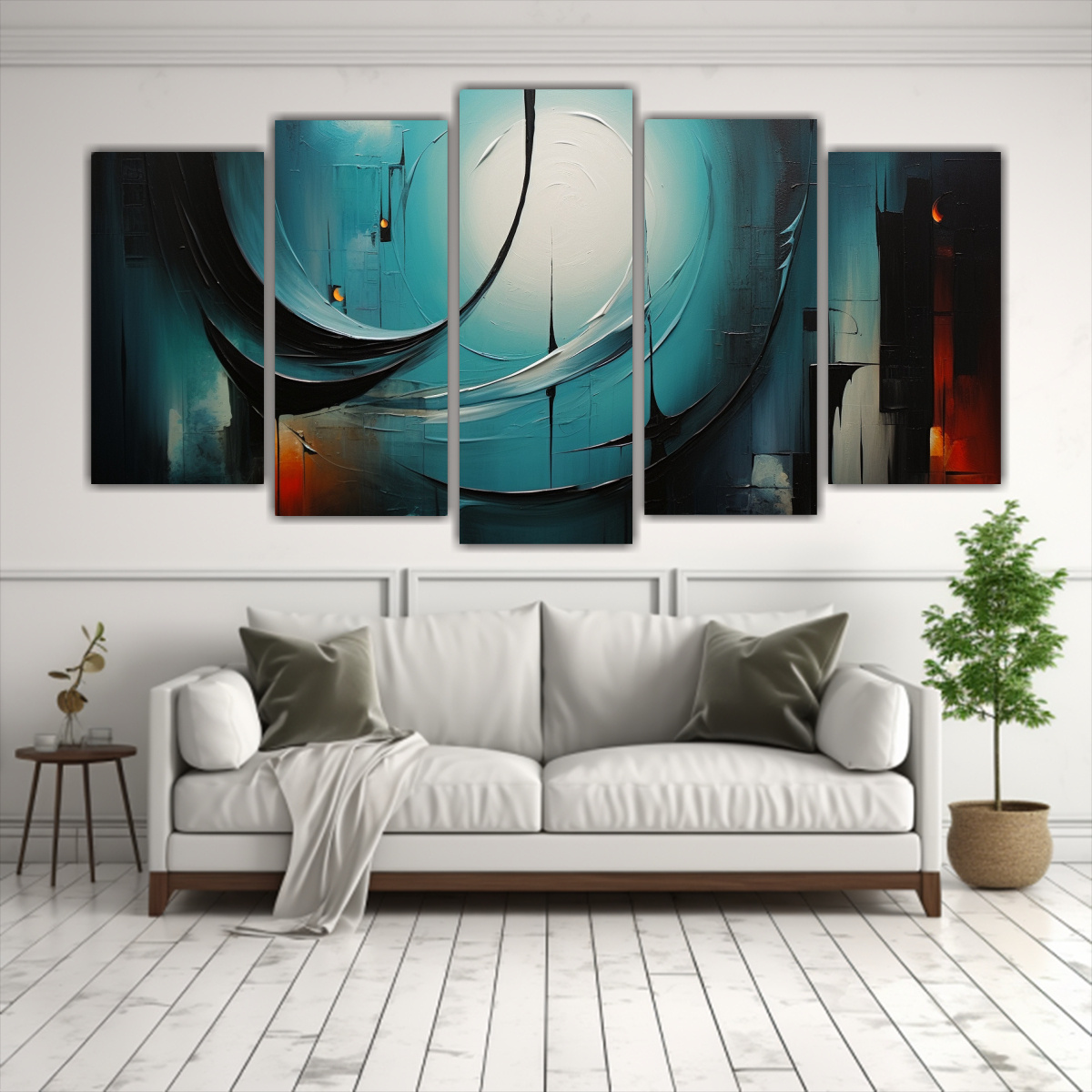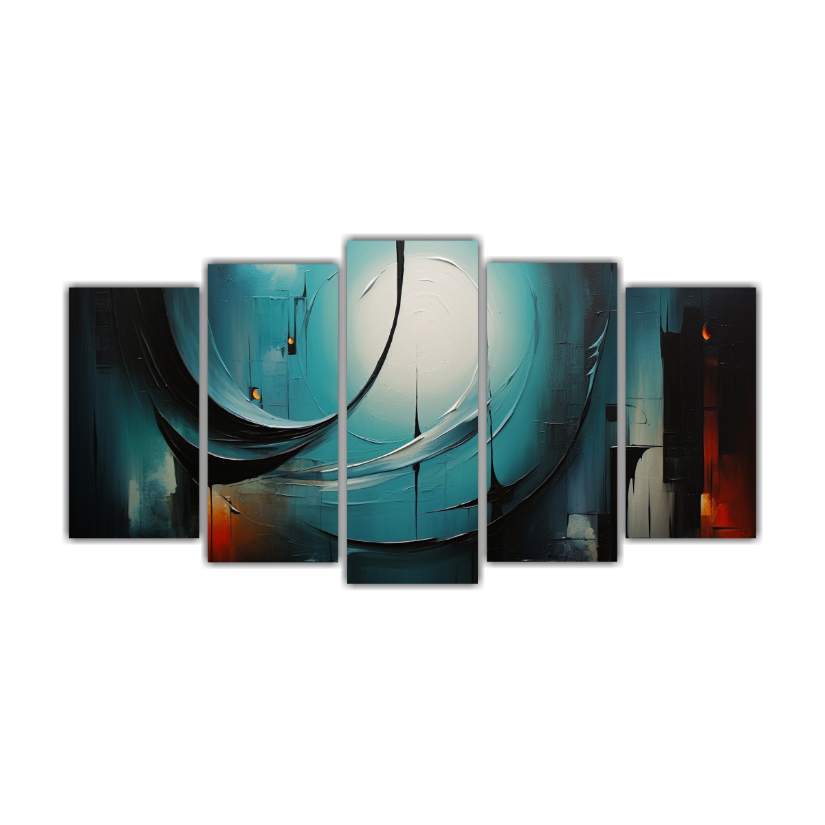 Este set de 5 cuadros decorativos abstractos en tonos plateado, turquesa, negro, menta, azul marino grisaceo, chocolate y coral es ideal para añadir un toque moderno y sofisticado a tu sala de estar Colócalos en una pared blanca o en tonos neutros para que resalten y combinen a la perfección con el resto de la decoración También puedes distribuirlos en diferentes paredes para crear un efecto visual único ¡No esperes más y dale vida a tu hogar con este hermoso set de cuadros decorativos!