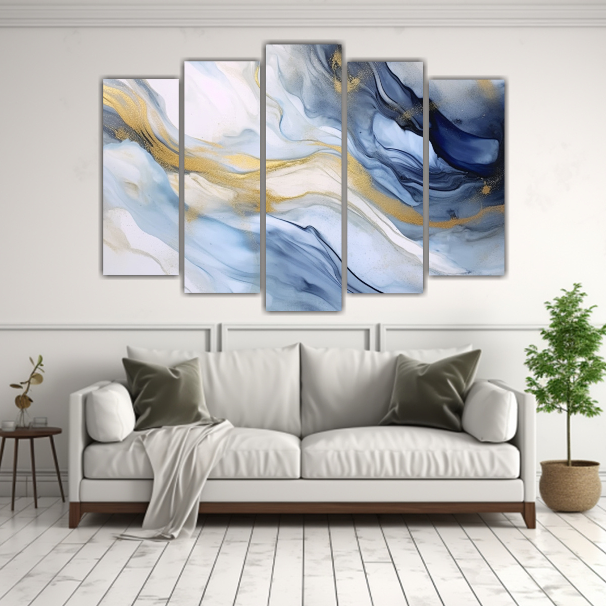 Pinturas Abstractas En Blanco Azul Oro: Cinco Cuadros Decorativos Vibrantes