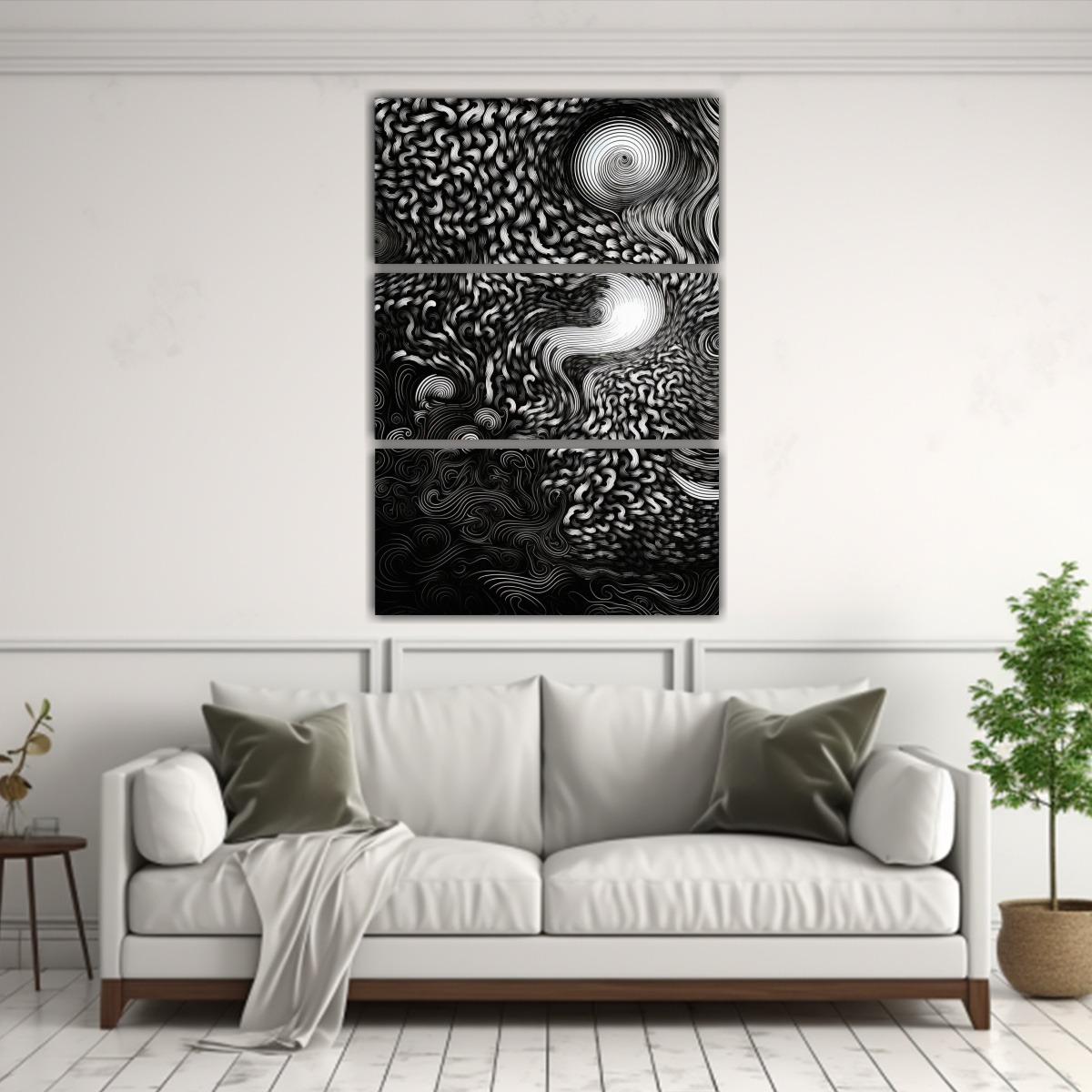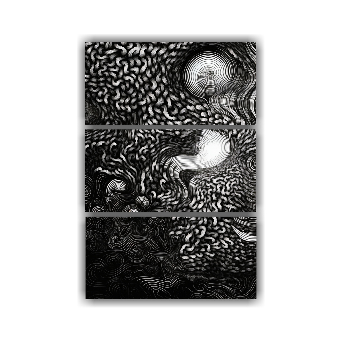 Decora tus espacios con estilo y elegancia con nuestro cuadro ‘Pinturas abstractas en blanco y negro con patrón a rayas y remolinos en estilo de luminosidad’ Hecho con tela de alta calidad y bastidores de madera, en DecoCuadros tenemos los mejores precios del mercado