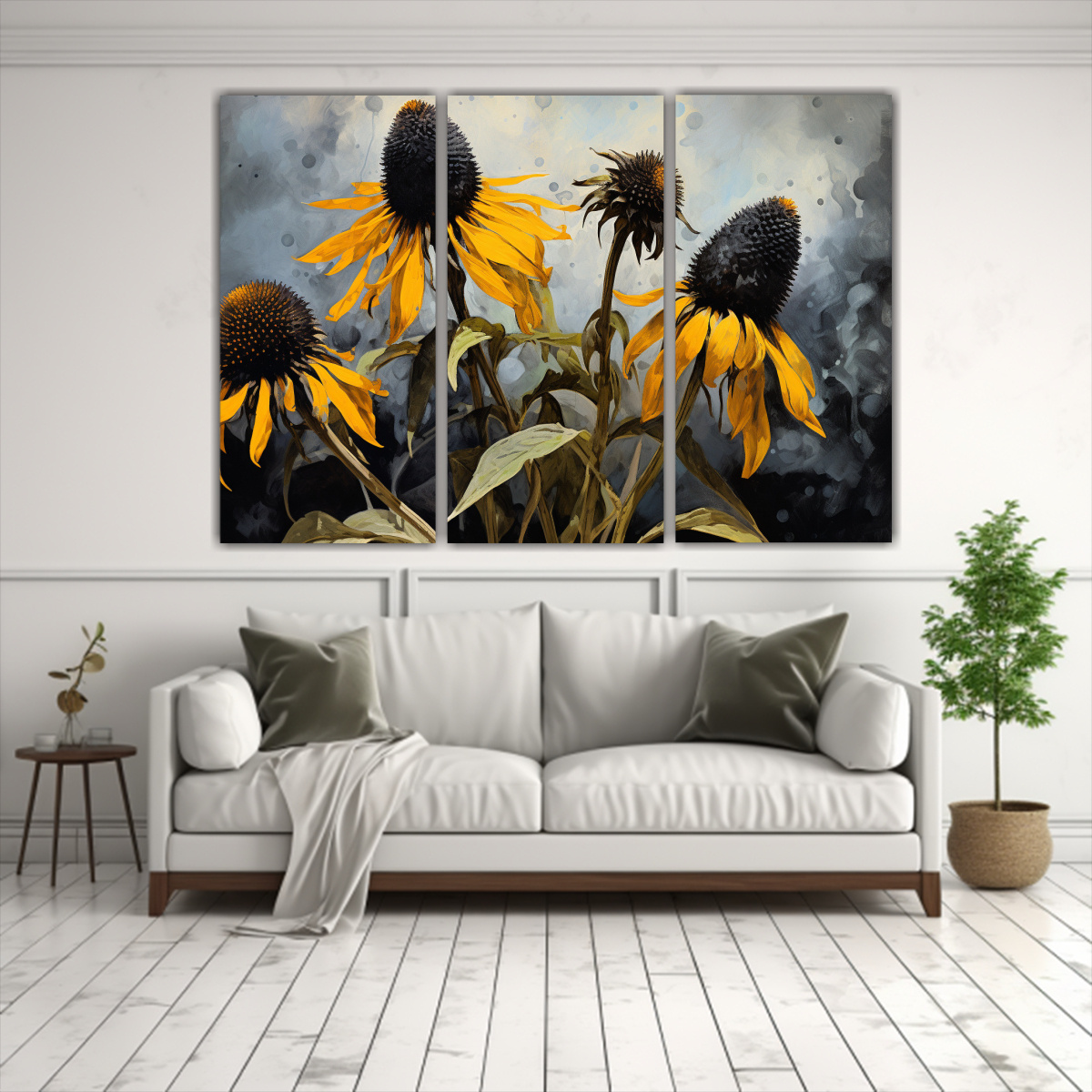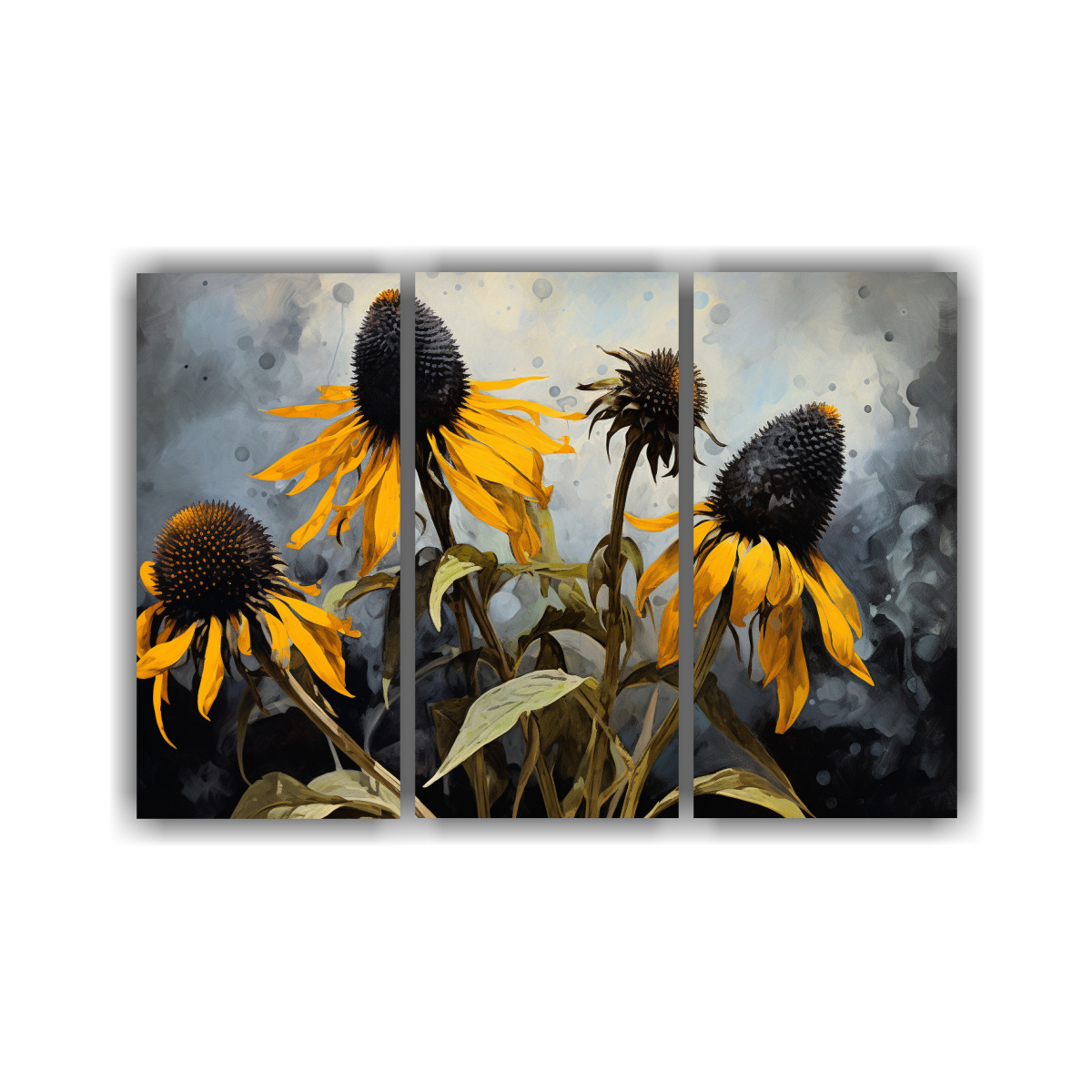 Para realzar la belleza de este cuadro abstracto de flores de tupinambo en colores negros, te recomendamos colocarlo en una pared blanca o gris claro, para que los tonos plateados, grises, mostaza, azul marino grisaceo y chocolate resalten y se conviertan en el centro de atención de la habitación Combínalo con muebles de líneas sencillas y accesorios en tonos neutros para lograr un equilibrio perfecto en la decoración de tu hogar