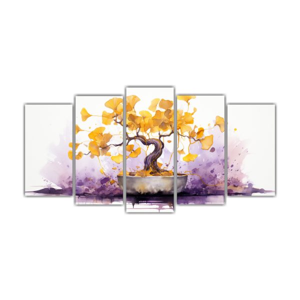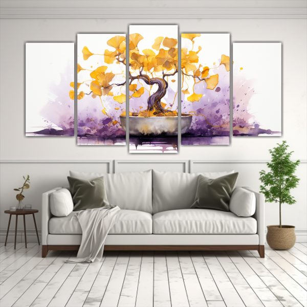 Pinturas Abstractas En Colores Púrpura Y Dorado Con Protagonismo De Un Bonsái De Ginkgo Biloba