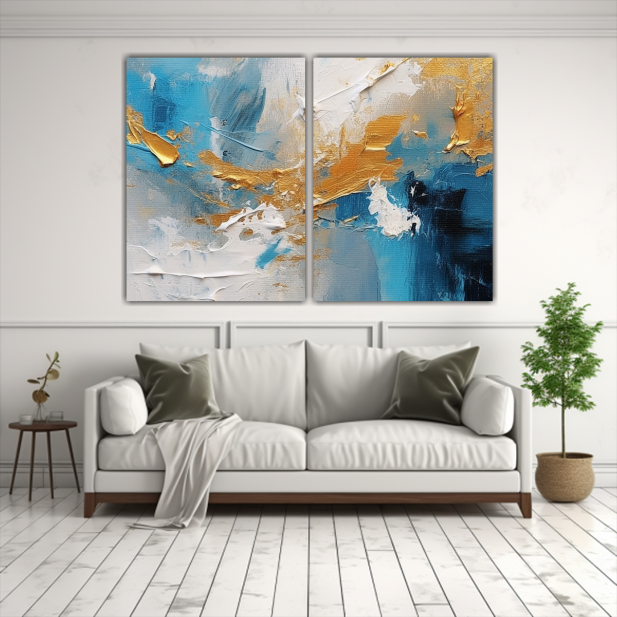 Este cuadro de pinturas abstractas en estilo Estilo óleo azul cielo y dorado sería perfecto para decorar un salón elegante o una oficina moderna Colócalo sobre un mueble oscuro para resaltar sus tonos dorados y plateados, creando un ambiente sofisticado y acogedor