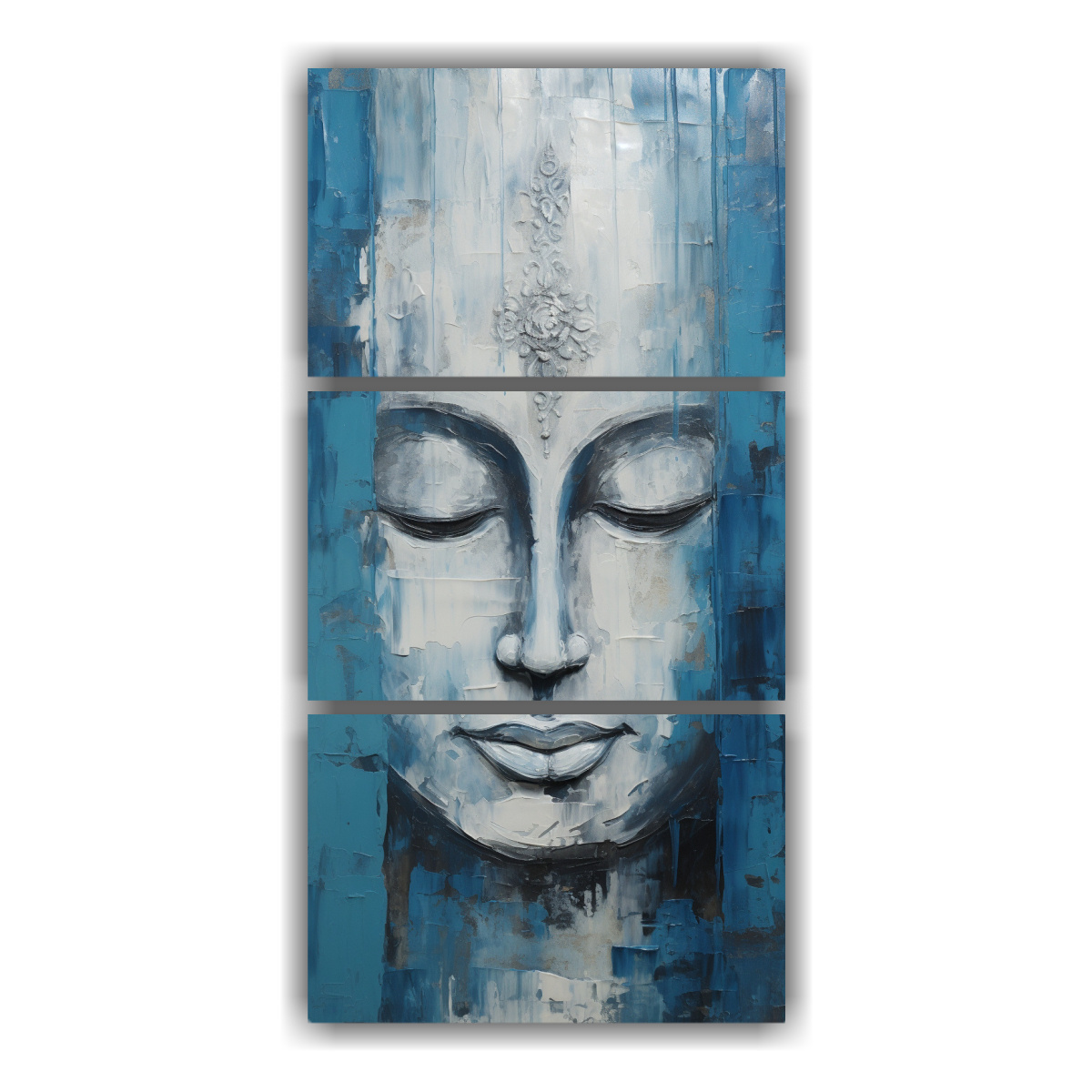 Este cuadro abstracto de expresión alegría Buddha en tonos azul, plata y verde azulado sería ideal para colocar en el living room sobre un sofá blanco, creando un contraste moderno y sofisticado ¡Dale vida a tus espacios con estilo!
