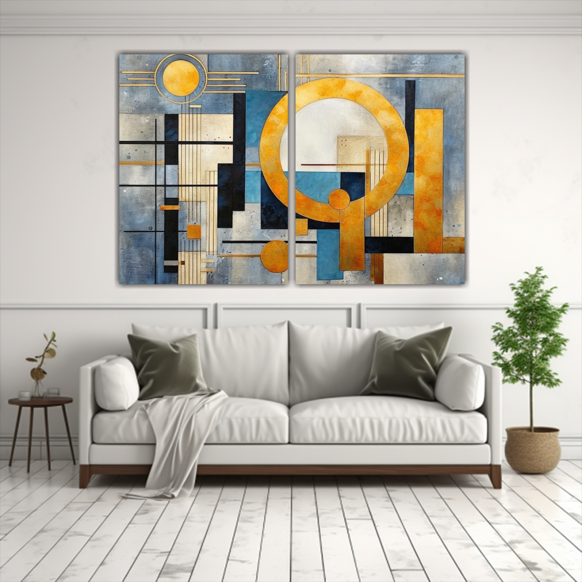 Este cuadro de Pinturas Abstractas Geométricas en tonos vibrantes de oro, azul, gris y más, es ideal para destacar en una pared principal de tu sala de estar, creando un punto focal moderno y elegante Combínalo con muebles en tonos neutros para un contraste equilibrado