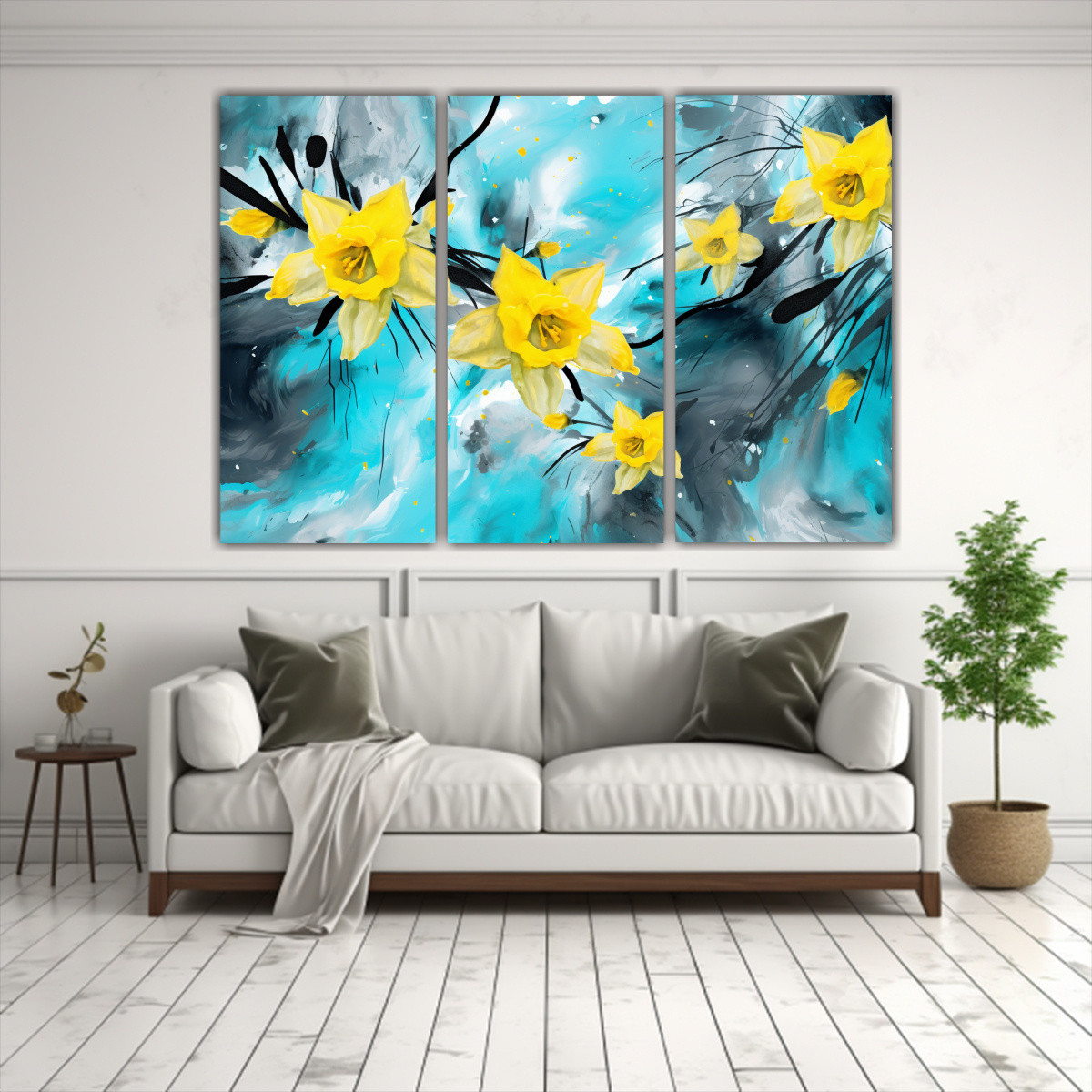 Este cuadro abstracto de narcisos en turquesa y negro sería ideal para decorar un living moderno, aportando un toque de elegancia y sofisticación Combínalo con muebles en tonos neutros y accesorios dorados para crear un ambiente armonioso y contemporáneo