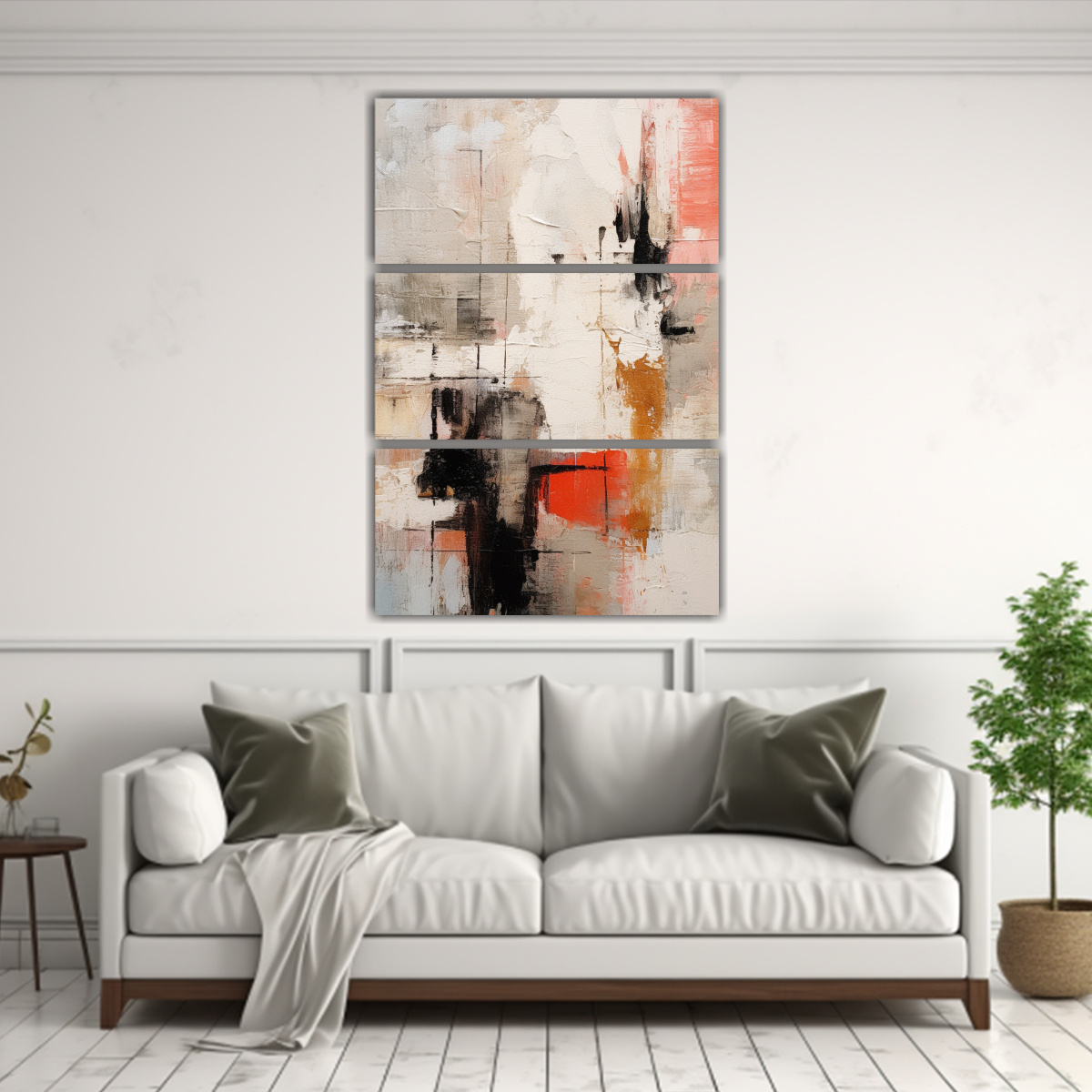 Este set de 3 pinturas abstractas minimalistas estilo boho en tonos plateado, negro, gris, carmesí, beige y azul marino grisáceo es perfecto para decorar una sala de estar moderna Coloca los cuadros en línea horizontal sobre un sofá gris claro para crear un contraste elegante Añade cojines en tonos neutros y una alfombra de pelo largo para completar el estilo boho de tu espacio