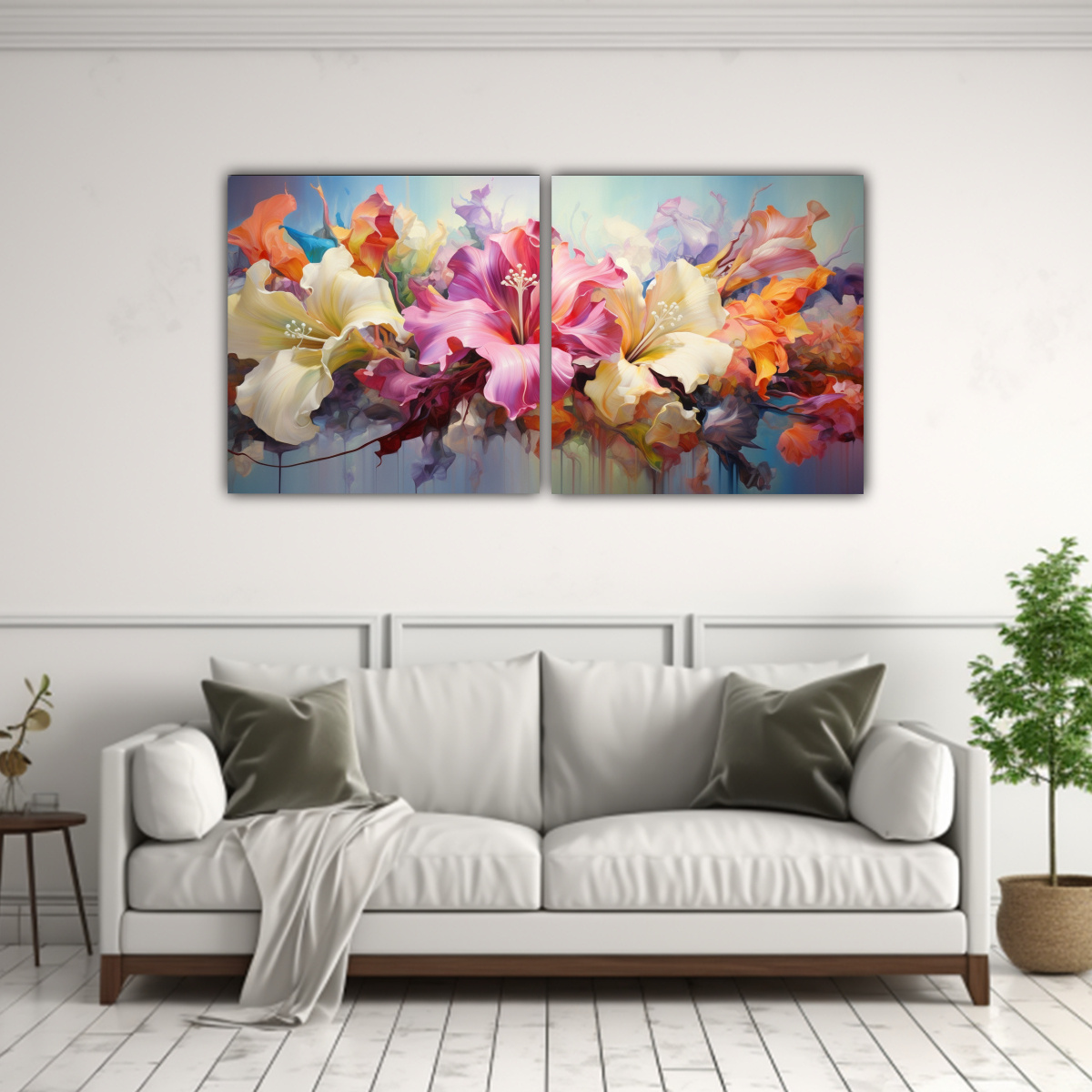 Este cuadro es perfecto para decorar cualquier espacio en tu hogar Puedes colocarlo en la sala de estar, sobre un sofá en tonos neutros como gris o beige, para crear un contraste moderno También puedes combinarlo con cojines en los colores del cuadro y agregar cortinas en tonos plateados para un ambiente elegante y sofisticado ¡Atrévete a darle vida a tus paredes con este hermoso cuadro de flores abstractas!