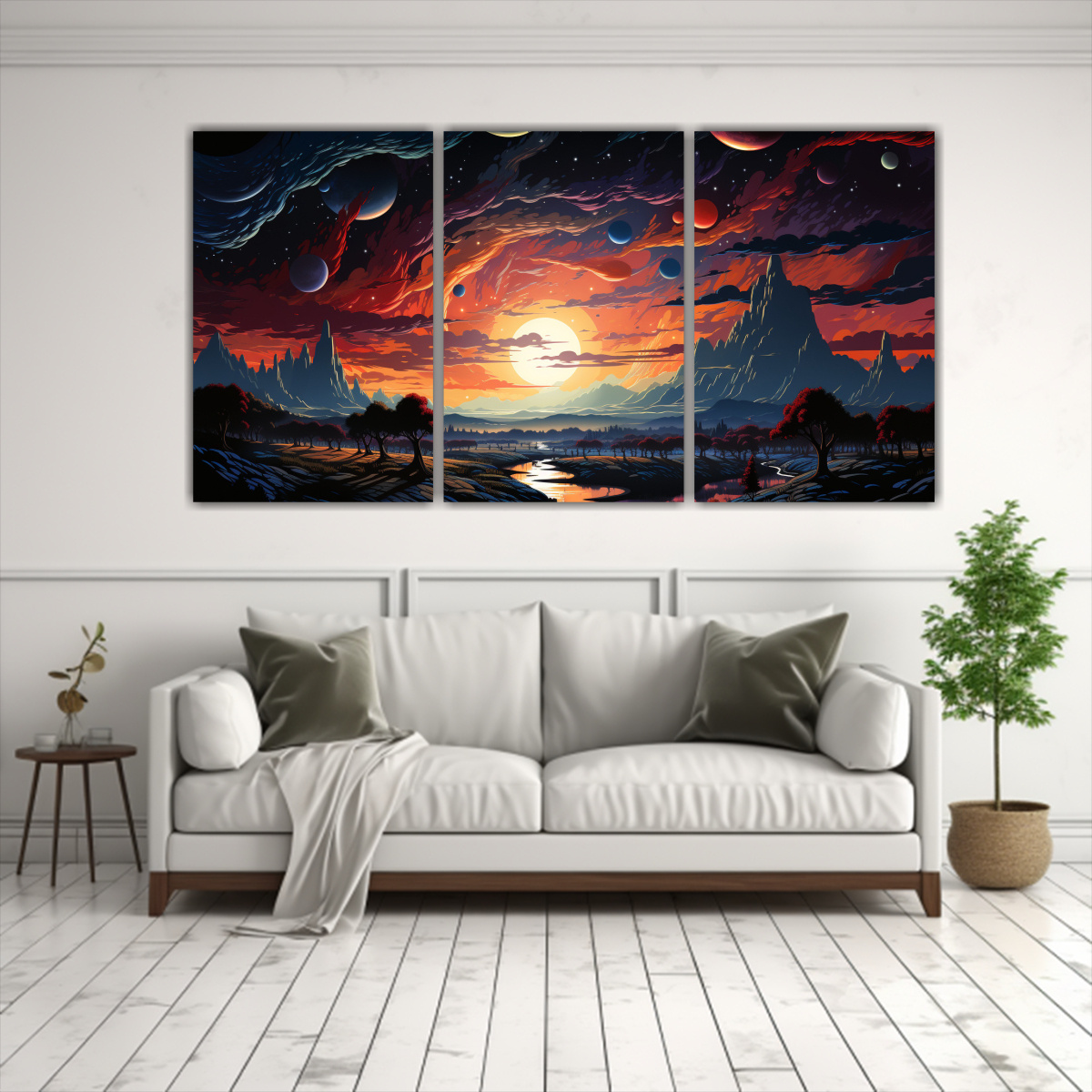 Este set de 3 cuadros abstractos urbanos en estilo cómic retro con agujero negro psicodélico es perfecto para decorar tu sala de estar o estudio Puedes colocarlos en una pared blanca para crear un contraste llamativo o combinarlos con muebles de colores neutros para darles protagonismo También puedes ponerlos en un pasillo largo para crear un efecto de profundidad y dinamismo ¡Deja volar tu imaginación y dale vida a tus espacios con estos cuadros exclusivos de DecoCuadros!
