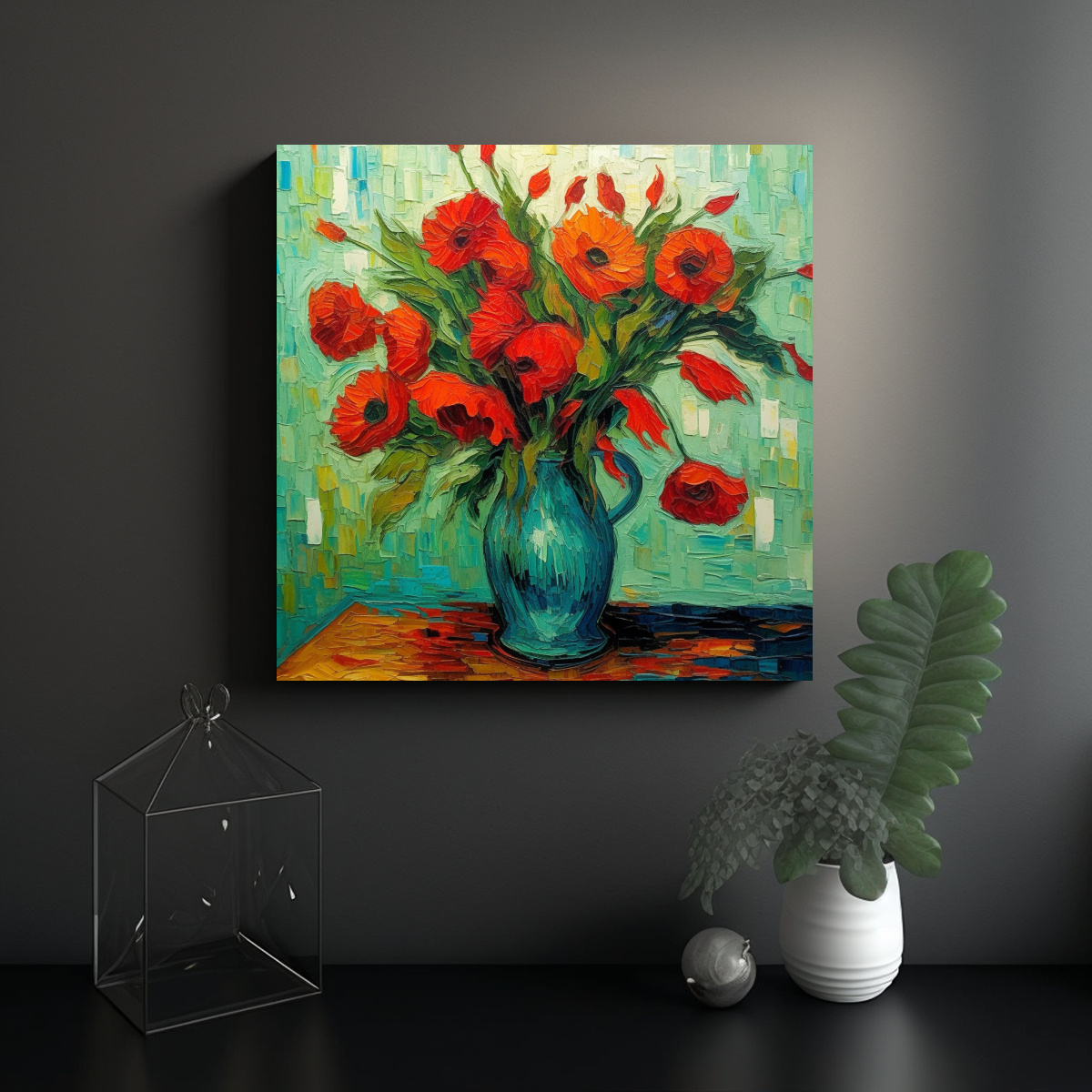 Este cuadro ‘Flores rojas y hojas verdes’ encajaría perfectamente en un dormitorio o sala de estar de estilo clásico o moderno Colócalo sobre un mueble blanco para resaltar sus colores o en una pared color verde azulado para crear un contraste armonioso