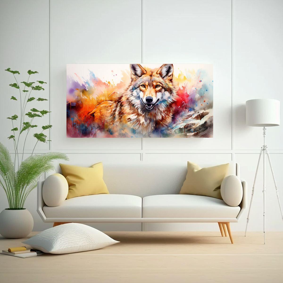 Para realzar la belleza del cuadro ‘Coyote Colorido Estilo Acuarelas 21’, te recomendamos colocarlo en la pared principal de tu sala de estar Combínalo con muebles en tonos neutros como blanco o beige, y añade cojines en los mismos colores de la pintura para lograr un ambiente armonioso y moderno