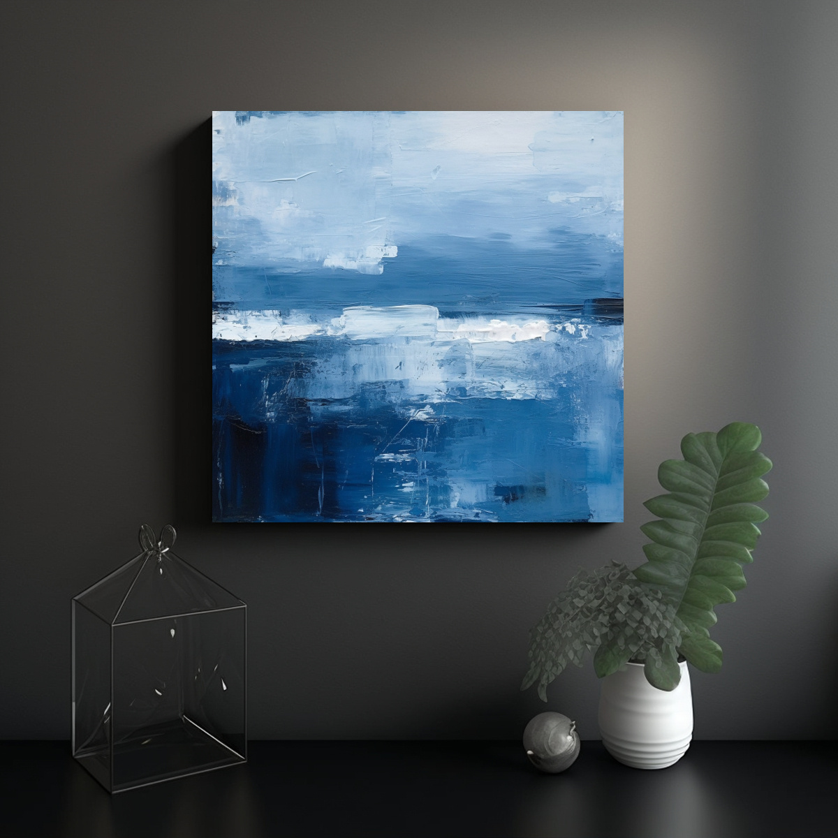 Este cuadro azul abstracto se vería espectacular en una sala de estar moderna, combinándolo con muebles blancos y detalles plateados para resaltar su belleza ¡Añade un toque de sofisticación a tu hogar con esta pieza única!