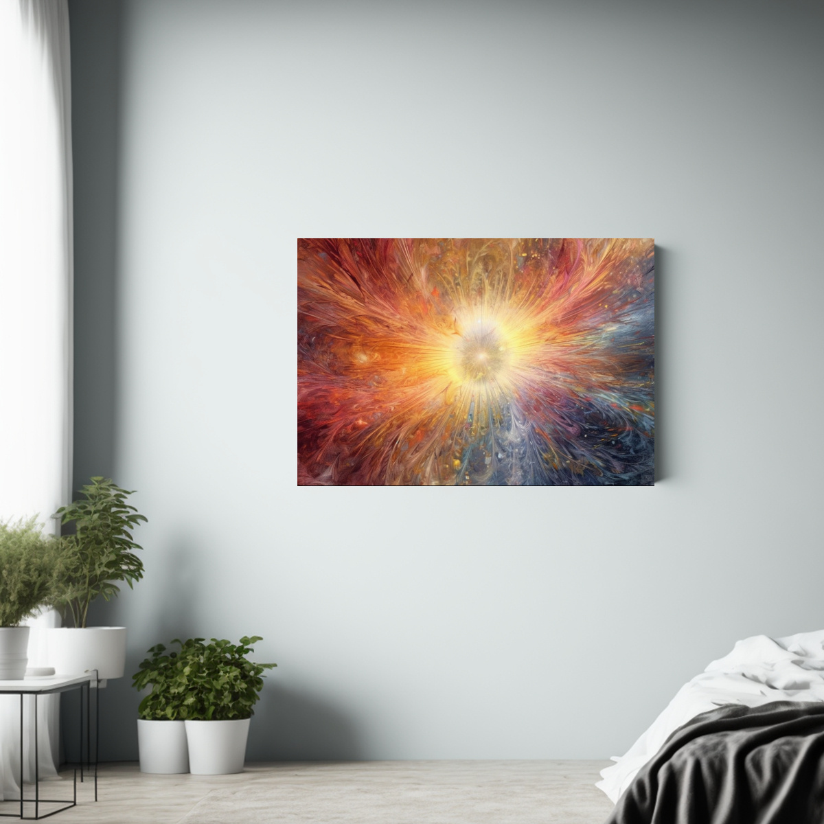 Para realzar la serenidad de tu sala de estar, recomendamos colocar este cuadro en la pared principal sobre un sofá blanco La combinación de colores suaves y vibrantes creará un ambiente celestial y acogedor en tu hogar