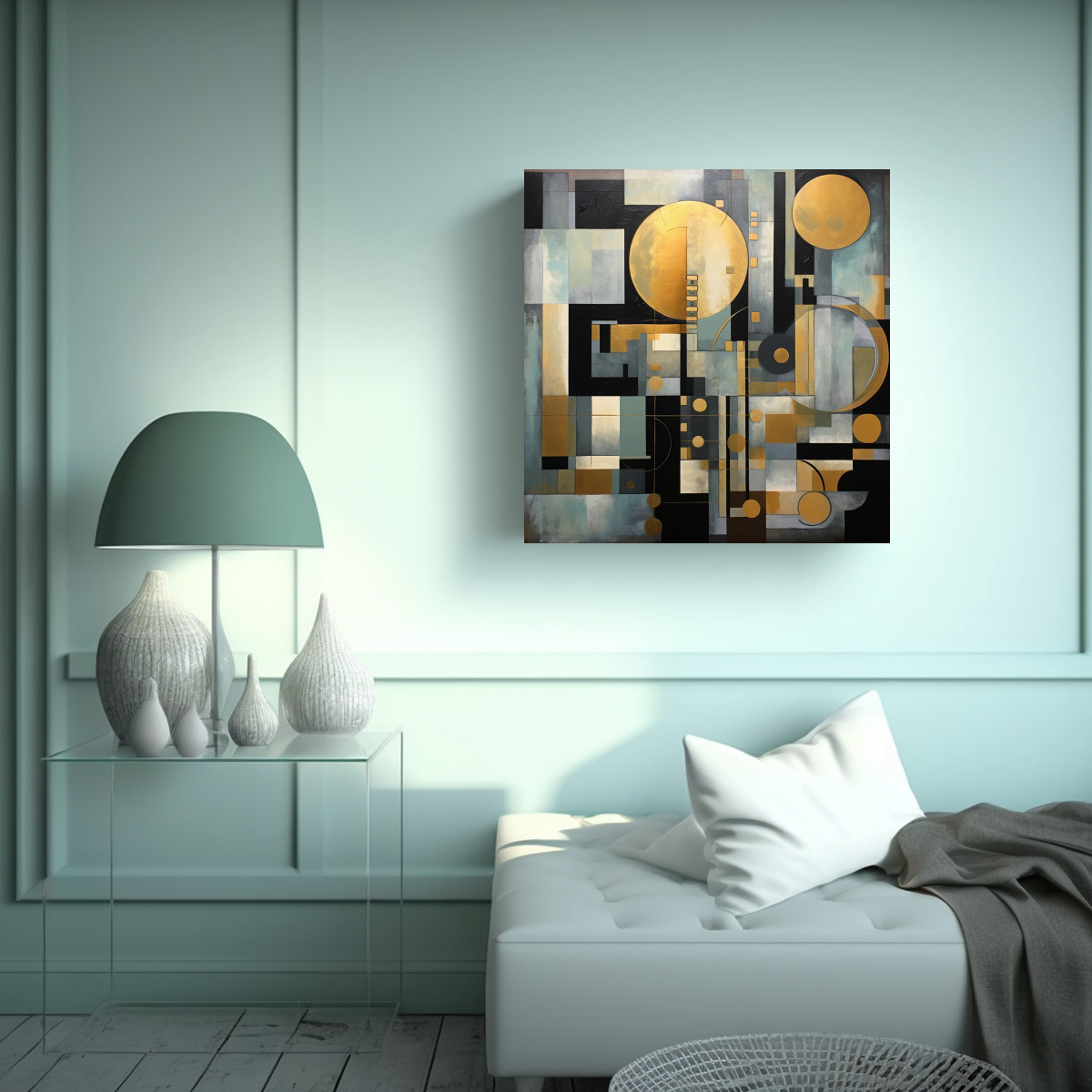 Este cuadro de arte abstracto con formas geométricas y colores plateado, azul marino grisaceo, gris, chocolate y mostaza es perfecto para decorar tu sala de estar Colócalo sobre un sofá de tonos neutros para crear un contraste elegante y sofisticado También puedes combinarlo con cojines y cortinas en tonos similares para lograr una armonía visual en tu espacio