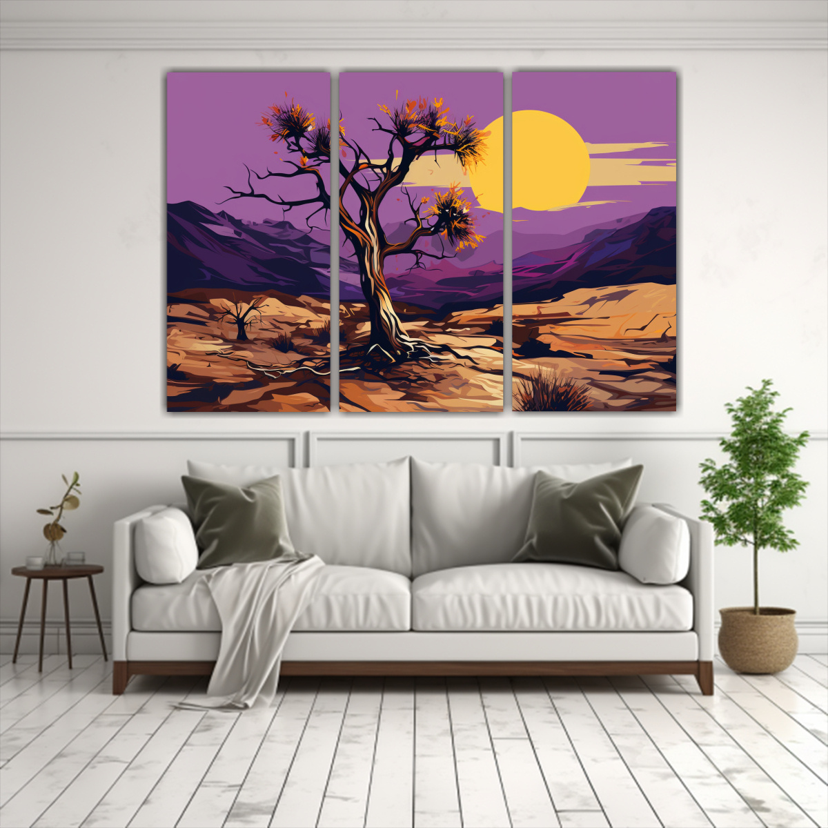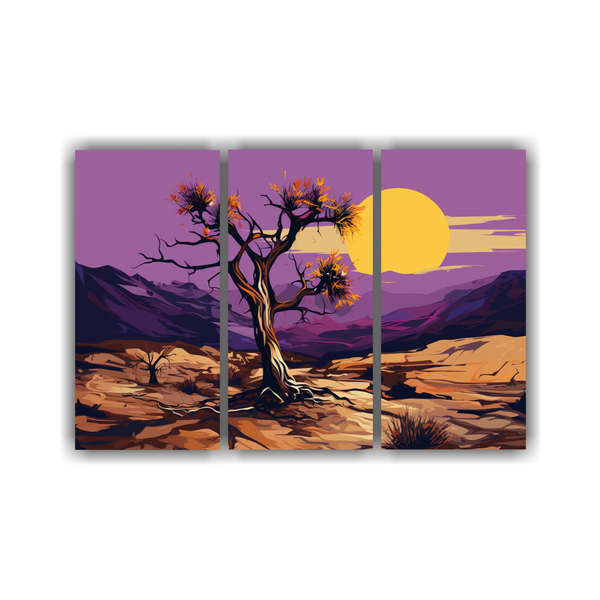 Set de 3 artes de pared creativa con equilibrio visual inspirado en Joshua Tree en colores púrpura y dorado para una atmósfera neonoir Aprovecha nuestras entregas exprés a regiones