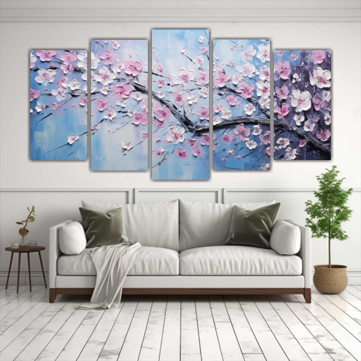 DecoCuadros te ofrece el Set 5 Artes de Pared Hermoso multicolor a vibrantes colores Cherry blossoms painting on can Cuadros impresos en tela de alta calidad con bastidores de madera Aprovecha nuestros precios económicos Enviamos a regiones express