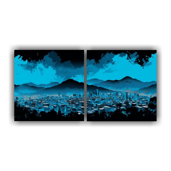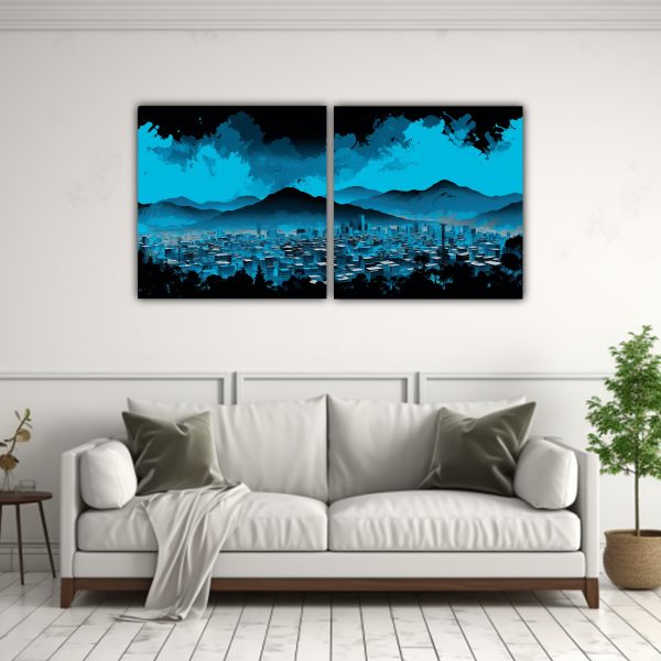 Díptico abstracto en colores negro y azul, perfecto para añadir un toque moderno a tus espacios Con tonos cian, verde azulado, gris y plateado, este cuadro es ideal para crear un ambiente sofisticado y elegante
