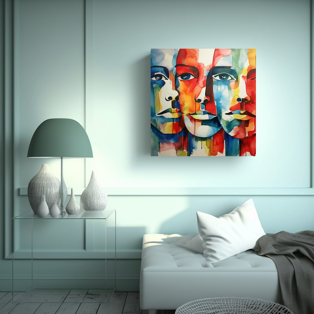 El cuadro Arte Cuadro Profundidad caras abstracto pop art Acuarela es ideal para darle vida a tus paredes Con colores Plateado, Carmesi, Azul Marino grisaceo, Coral, Gris, Turquesa, Verde Azulado, Menta, este cuadro destacará en cualquier ambiente