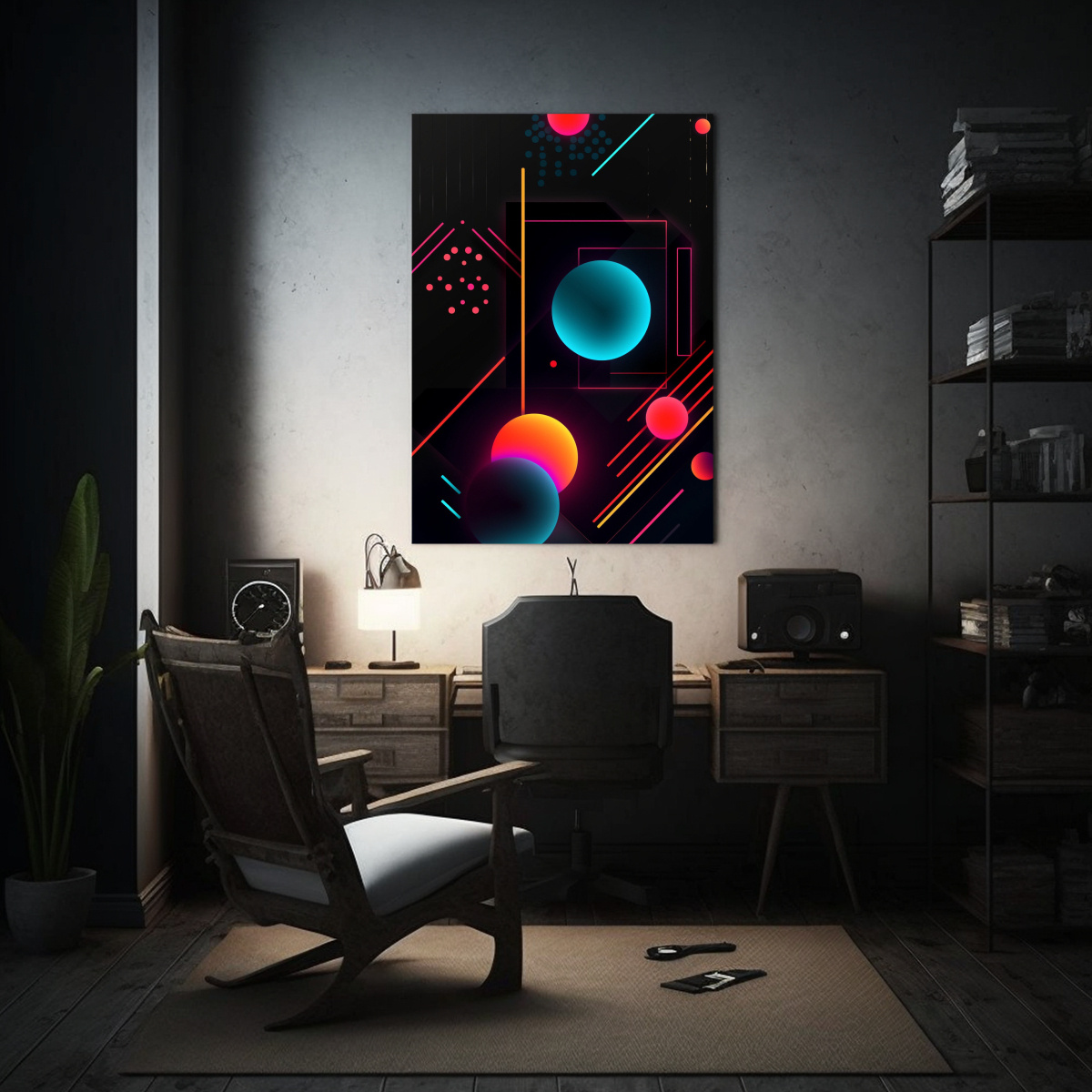 Este cuadro de formas geométricas neon sobre fondo negro es perfecto para decorar tu sala de estar o dormitorio Combínalo con muebles de colores neutros como blanco, gris o negro, y agrega algunos cojines o cortinas en tonos turquesa o coral para darle un toque de color ¡Crea un ambiente moderno y elegante con este cuadro único de DecoCuadros!
