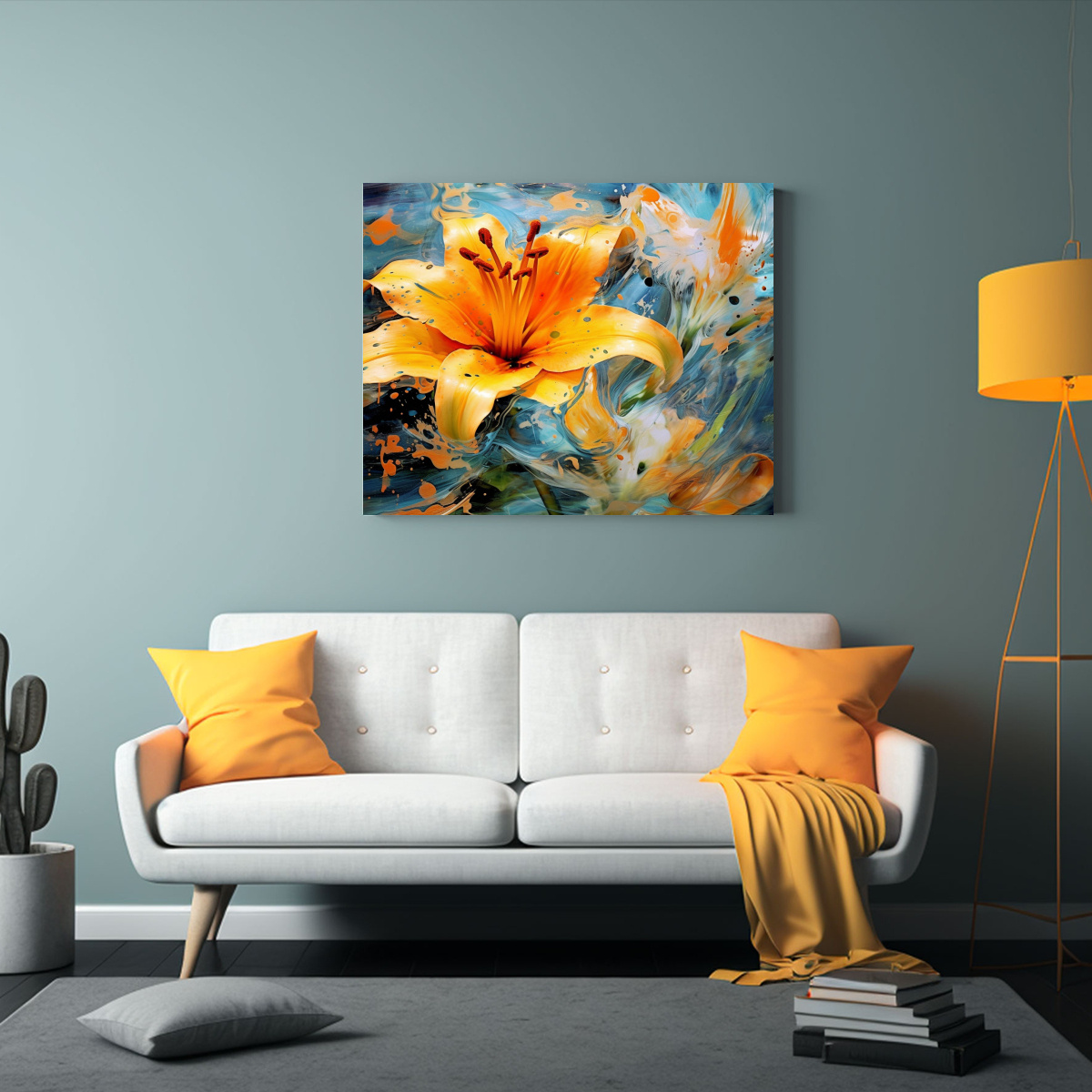 Pinturas De Decoración Con Lirio Naranja Inspirador Y Flores Amarillas En Estilo Dinámico.