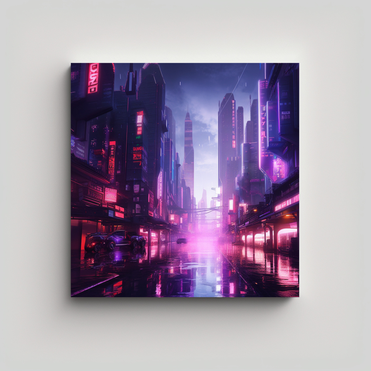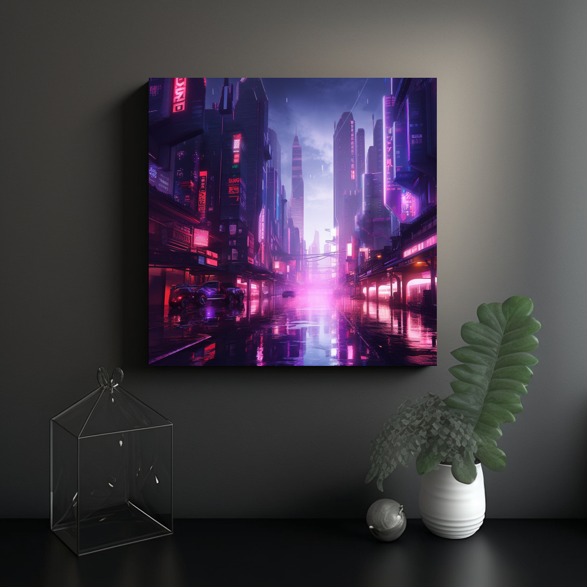 Este cuadro de arte callejero moderno en una ciudad cyberpunk futurista con rascacielos púrpuras sería perfecto como punto focal en una sala de estar de estilo moderno o en un espacio de trabajo creativo Combínalo con muebles minimalistas y accesorios en tonos neutros para resaltar su vibrante paleta de colores