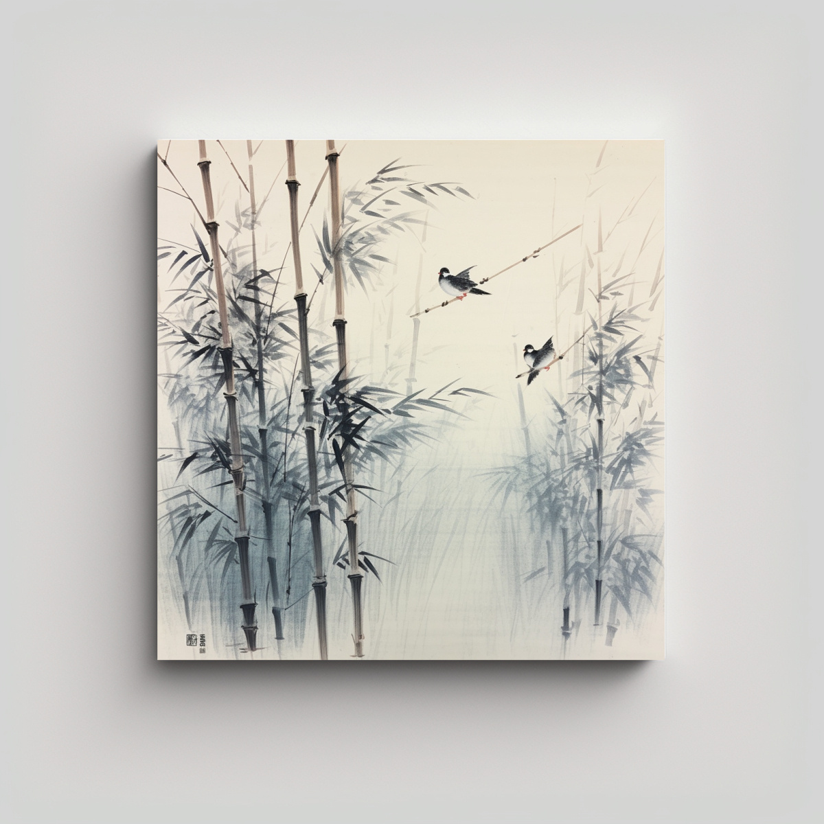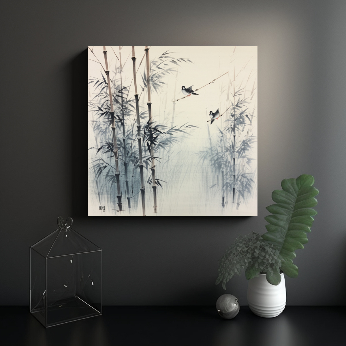 Este cuadro de bambú en tinta de arroz se vería espectacular en la sala de estar sobre un sofá de color crema, resaltando la armonía entre los tonos beige, azul marino grisáceo y plateado ¡Atrévete a decorar con estilo!