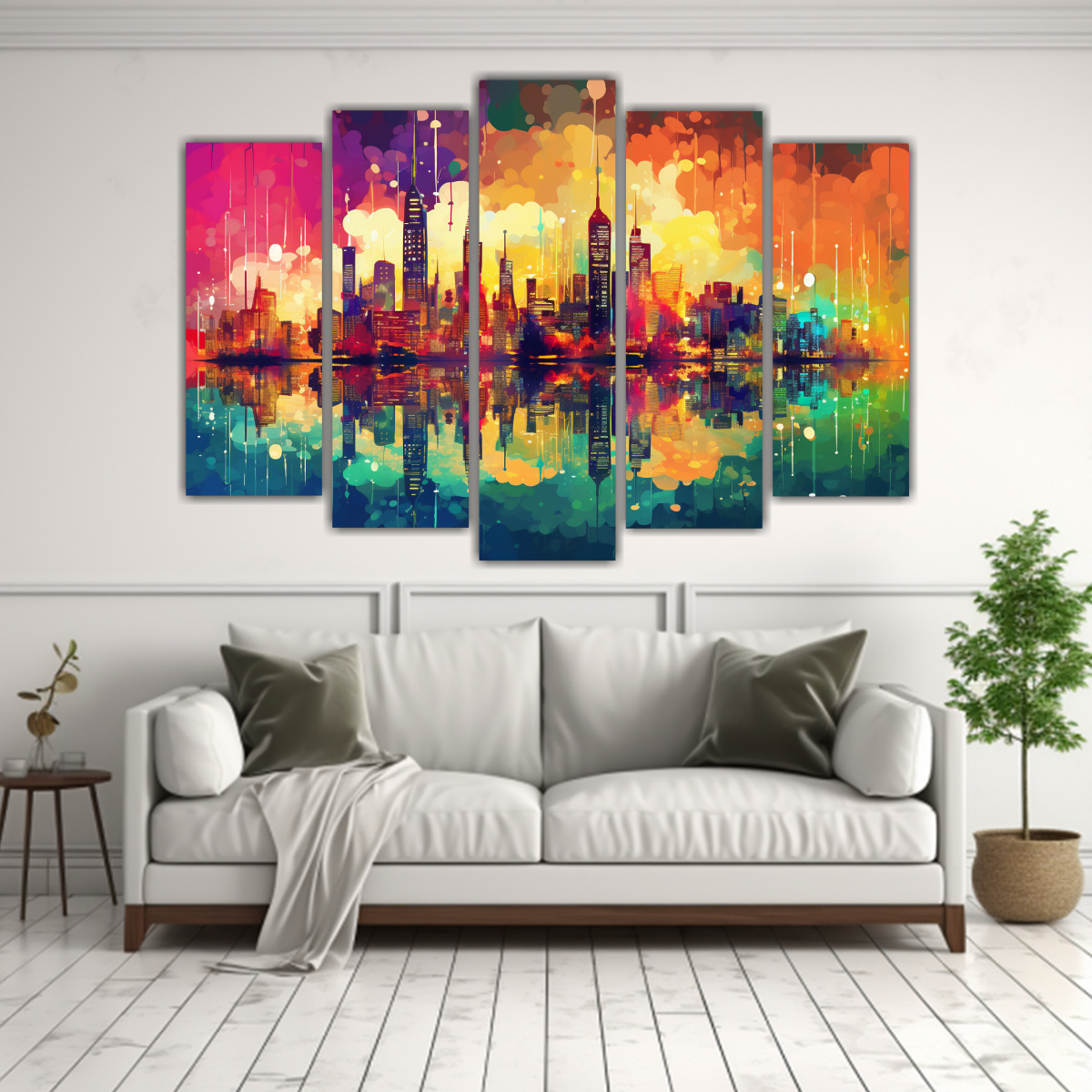 Coloca el cuadro Hermoso Armonía Ciudad en tu sala de estar para darle un toque moderno y colorido Combínalo con muebles en tonos neutros para resaltar la vibrante paleta de colores y crear un ambiente armonioso y alegre