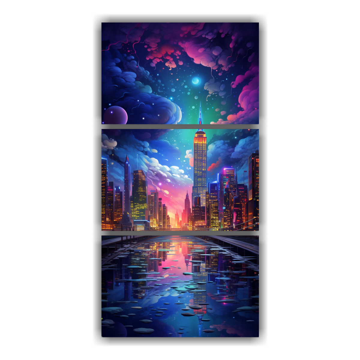 Decora tus espacios con el cuadro de tres lienzos de tela con finas líneas en una ciudad de Nueva York cubierta de luces coloridas La mejor calidad y los precios más bajos del mercado en DecoCuadros Entrega gratuita en Santiago y envíos express a regiones