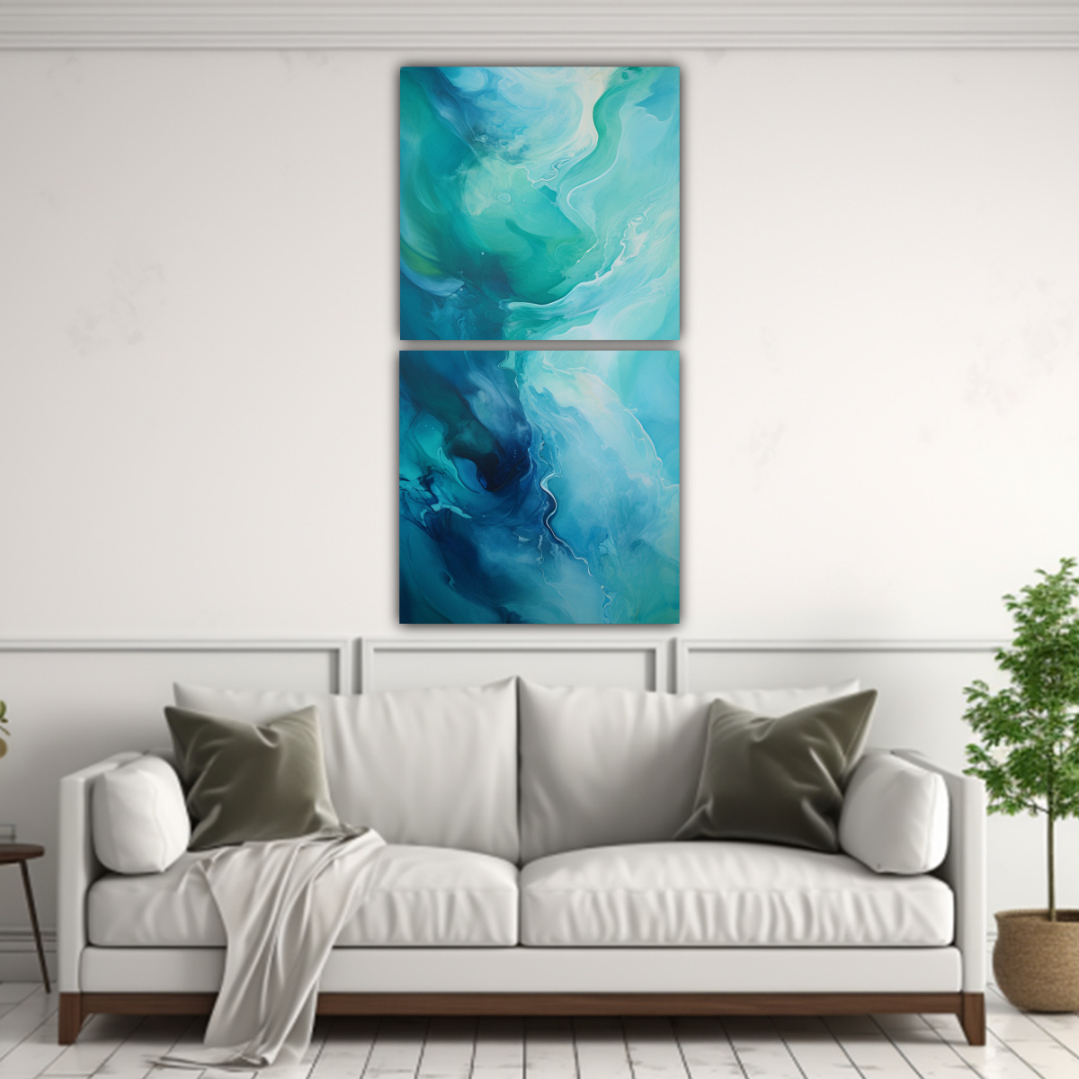 Pinturas De Decoración: Espectacular Alegría De Dos Artes Con Patrones Abstractos Giratorios En Azules Oceánicos.