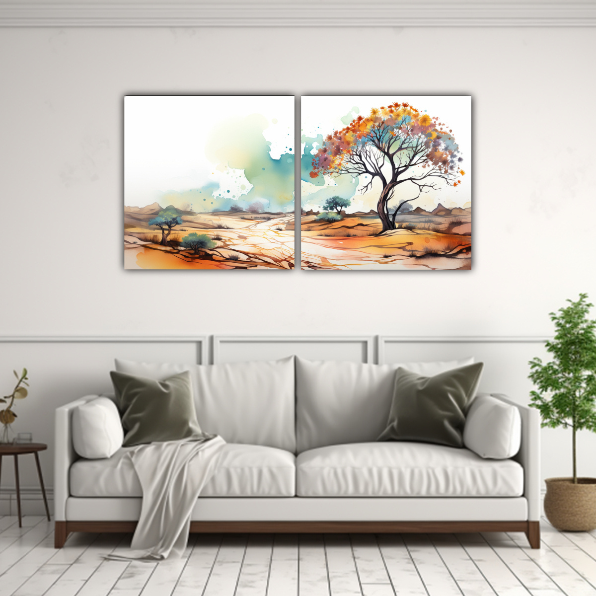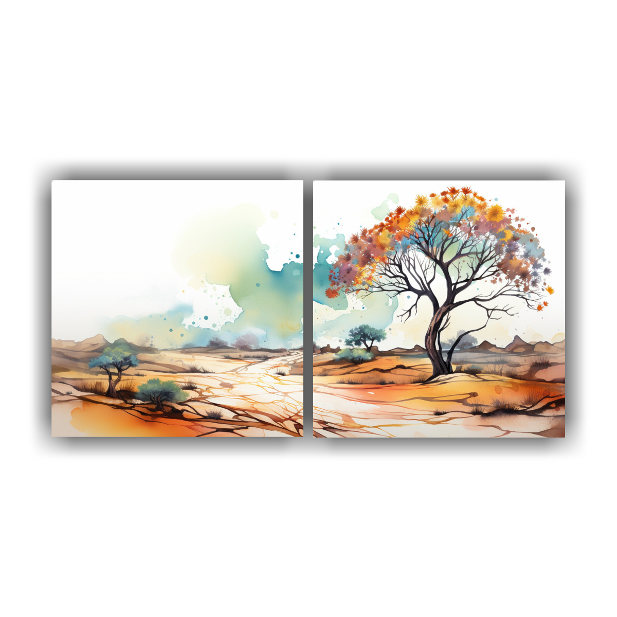 Pinturas De Decoración Moderna Estética De Dos Lienzos En Colores Acuarela De Una Sabana Y Un árbol En El Desierto Neonoir