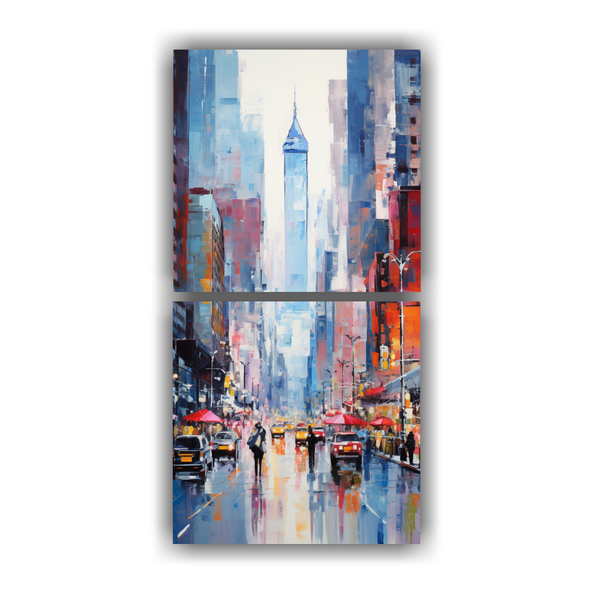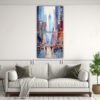 Este cuadro de calles urbanas en tonos vibrantes como el Turquesa y el Coral sería perfecto para decorar una sala de estar moderna Puedes colocarlo sobre un sofá blanco o una pared en tonos neutros para que resalte aún más Además, puedes complementar la decoración con cojines en tonos similares y cortinas en colores suaves para crear un ambiente acogedor y contemporáneo