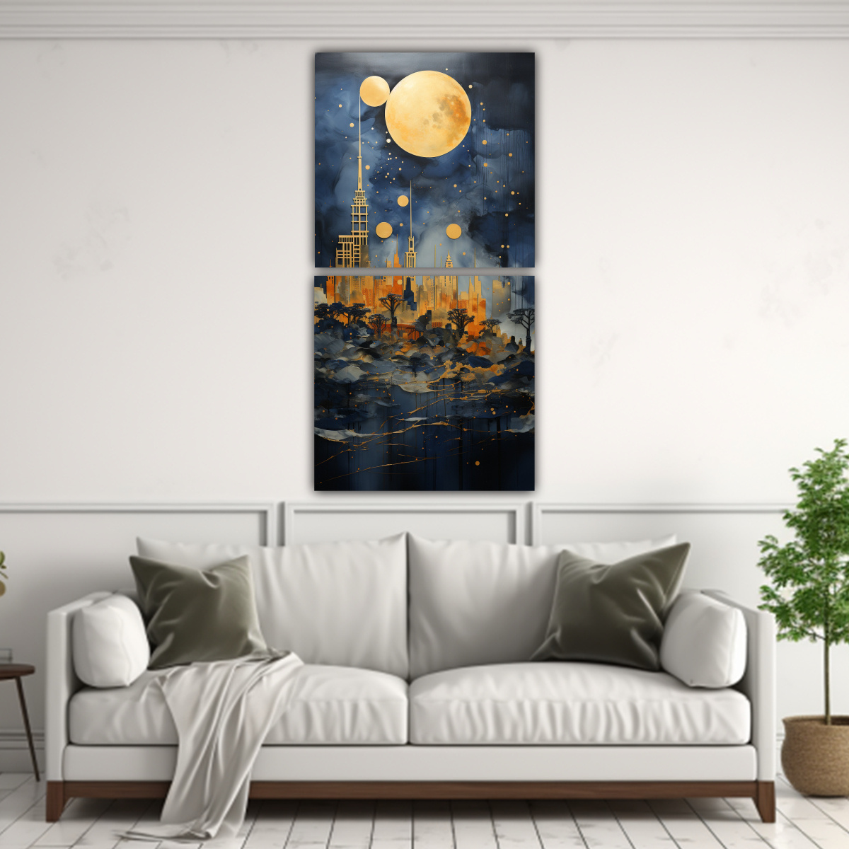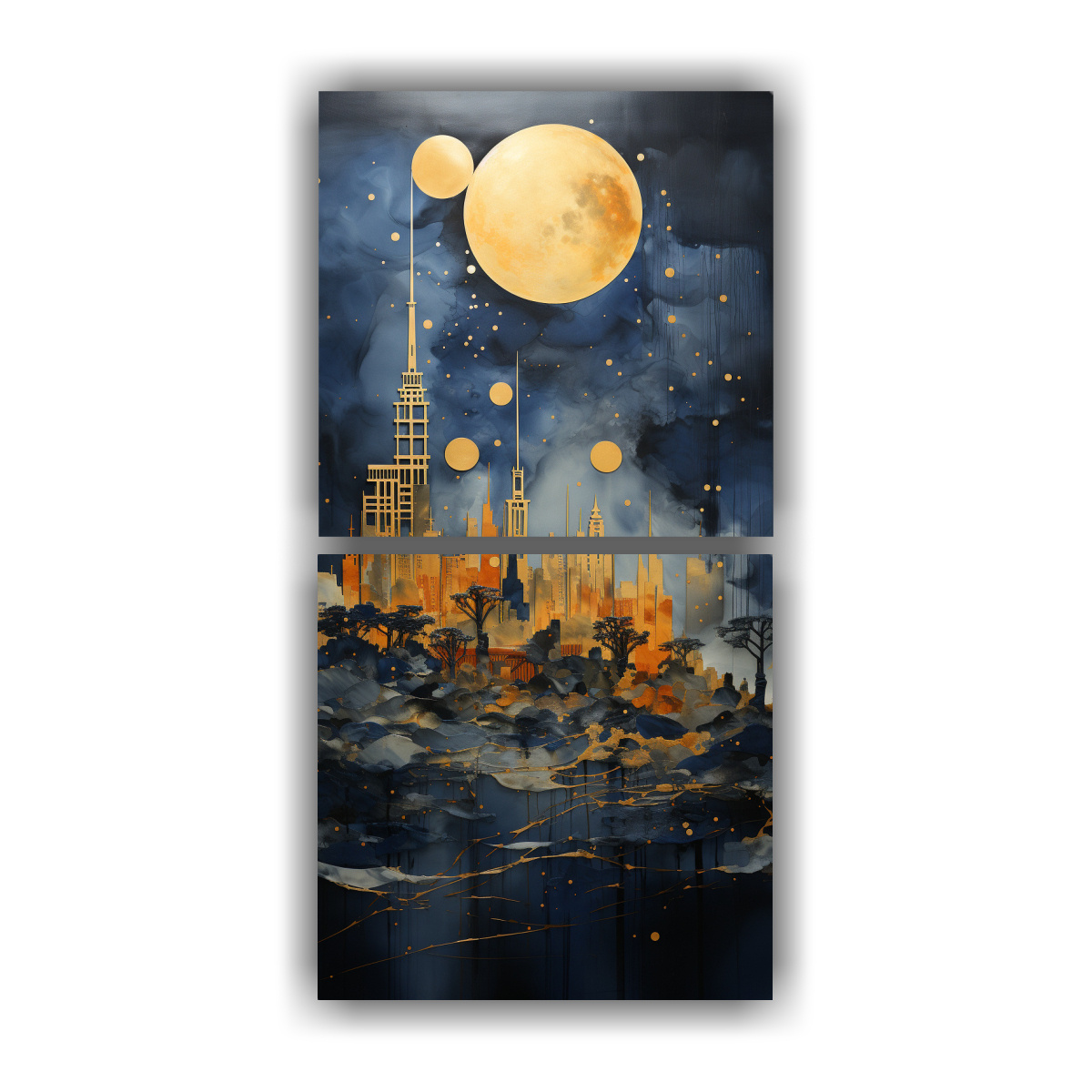 Este cuadro de decoración única en dos paneles sería ideal para colocar en el salón de tu hogar, justo encima del sofá Su combinación de colores, incluyendo coral, azul marino grisáceo, dorado, gris, beige y chocolate, lo hará destacar y se convertirá en el punto focal de la habitación Además, su diseño exclusivo y la alta calidad de impresión en tela con bastidores de madera le dará un toque de elegancia y originalidad a tu espacio No esperes más y adquiere este cuadro único en DecoCuadros, donde encontrarás la mejor calidad y los precios más económicos del mercado
