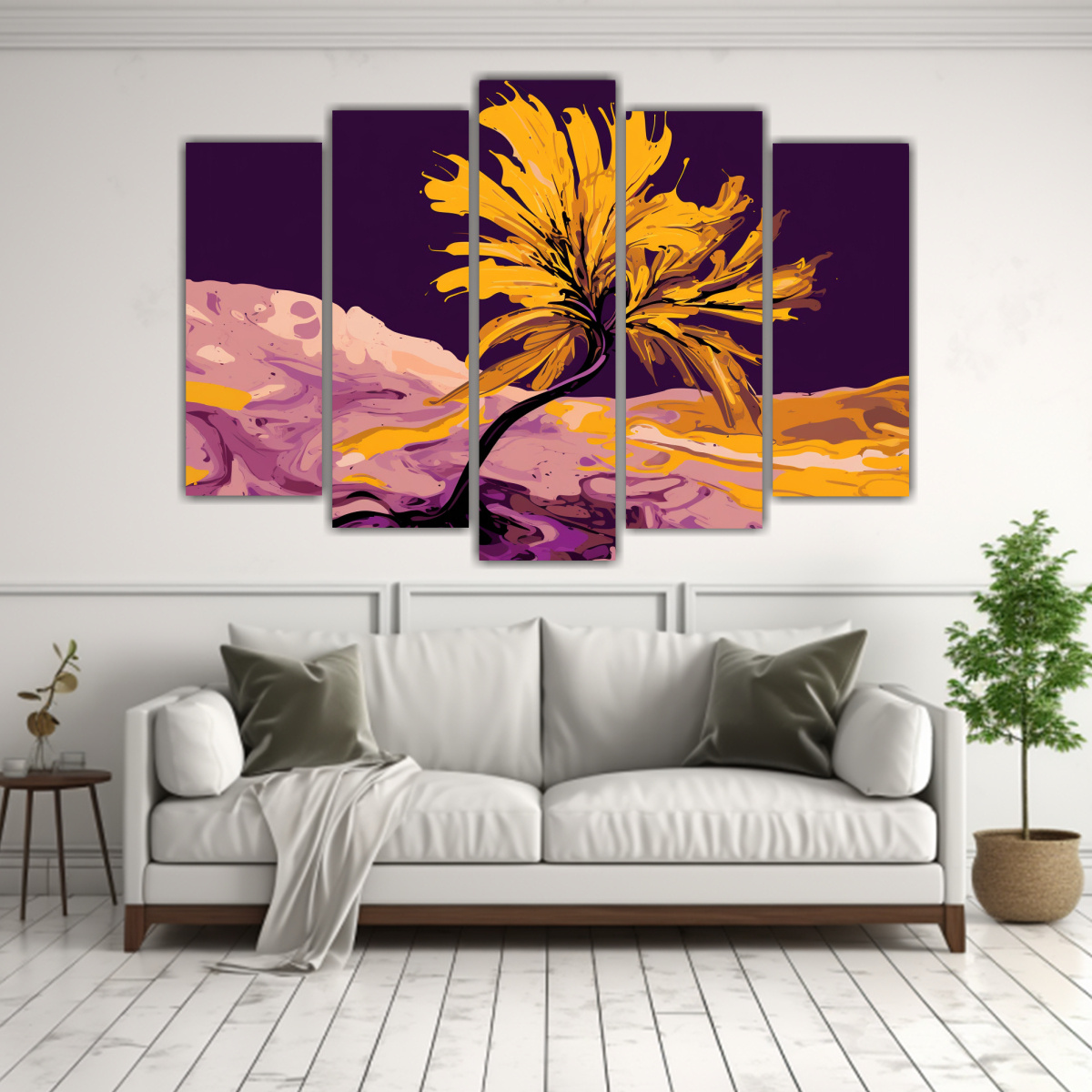 Este impactante cuadro de Joshua Tree en tonos púrpura y oro sería ideal para decorar una sala de estar moderna Colócalo sobre un sofá blanco para crear un contraste elegante y sofisticado en tu espacio