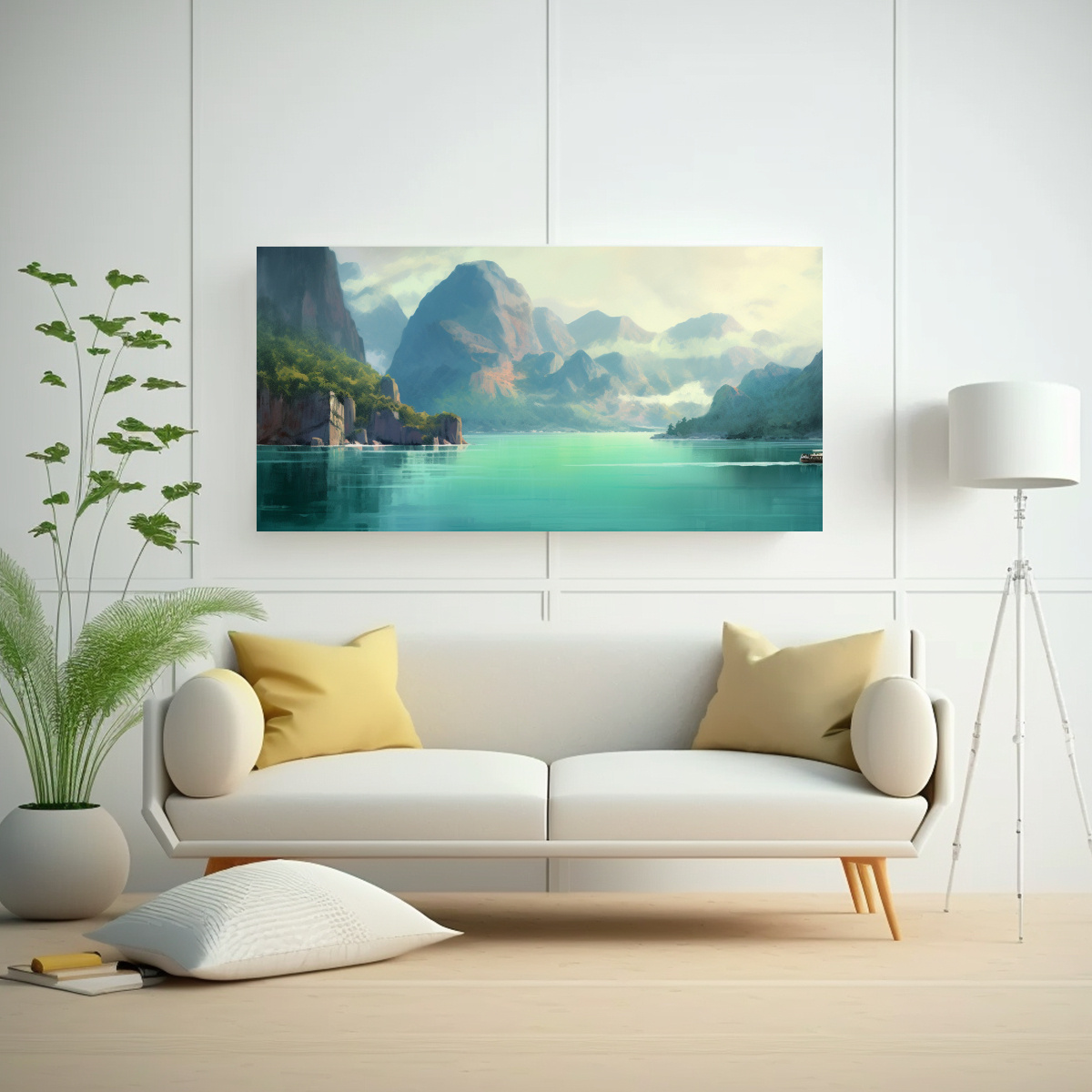 Este cuadro con paisaje de montañas y agua brillante sería ideal para decorar tu sala de estar Colócalo sobre un mueble en tonos neutros para resaltar sus colores y crear un ambiente relajante Complementa con cojines en tonos Menta y Plateado para un toque elegante y moderno