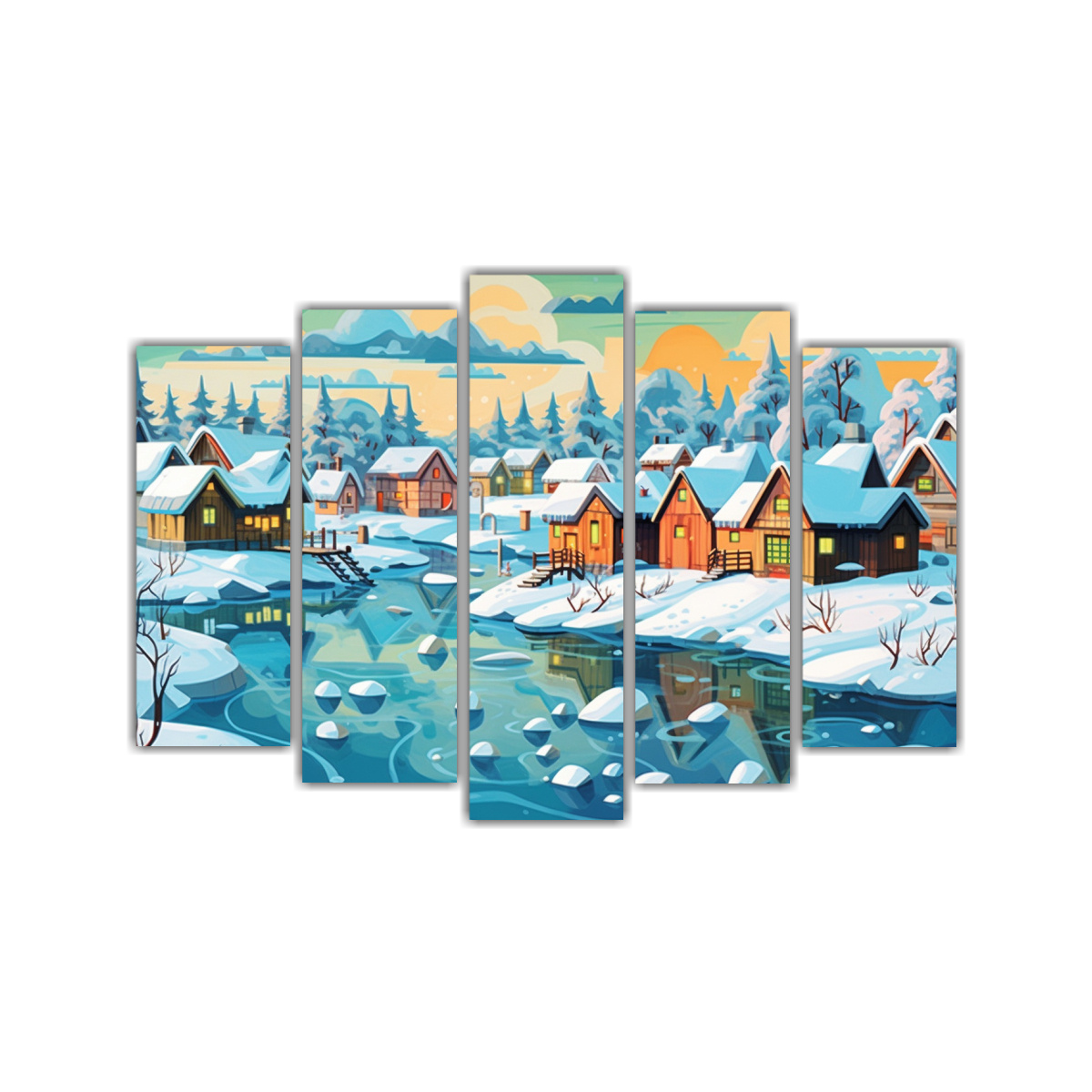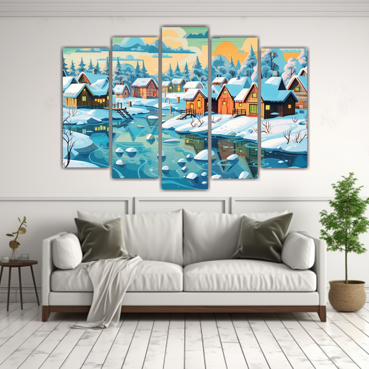 Pinturas De Paisajes Nórdicos En Bastidor: Aldea Brillante Con Lago Turquesa