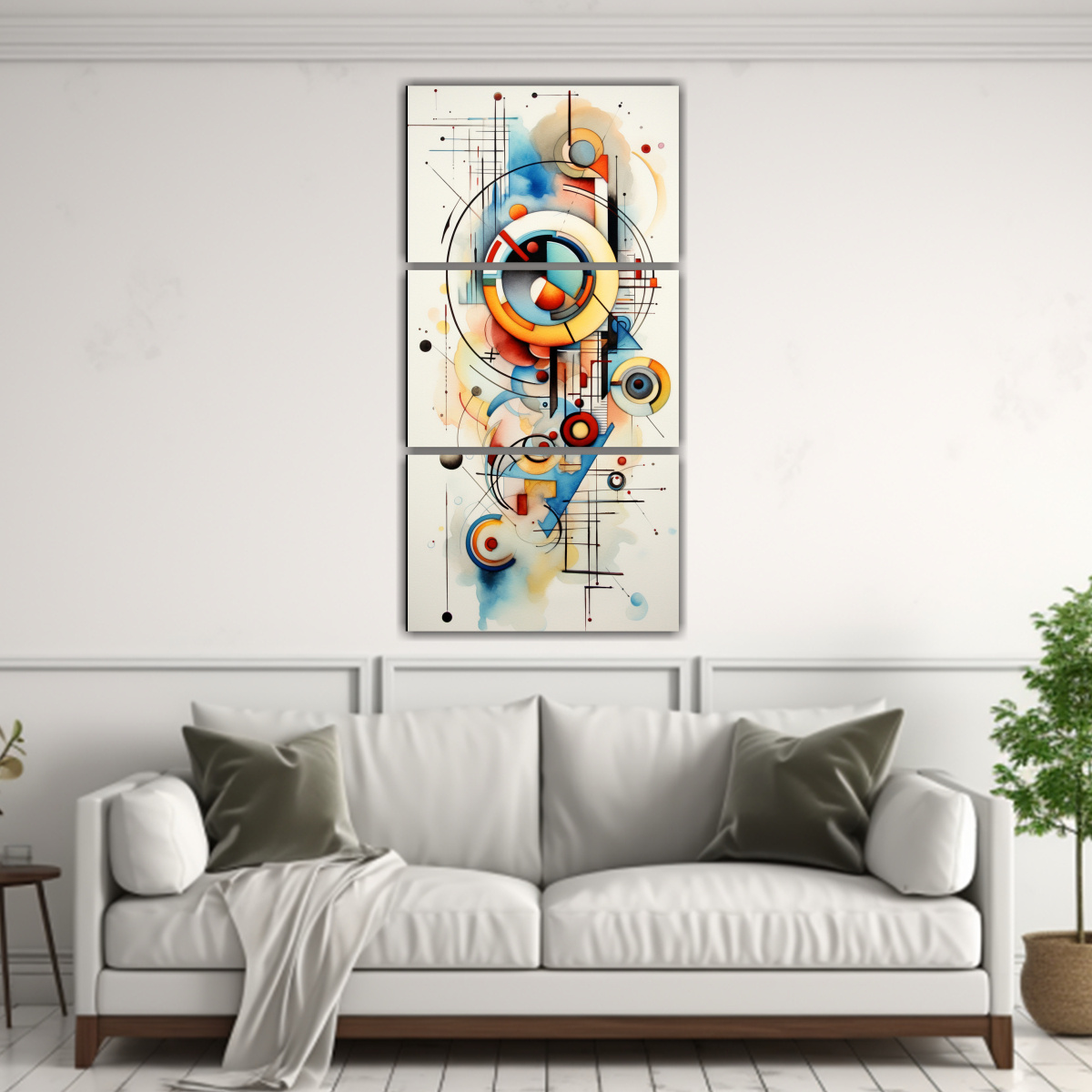 Este cuadro de pared abstracto Kandinsky en tonos beige, azul marino grisáceo y coral sería perfecto para decorar una sala de estar moderna Puedes colocarlo sobre un sofá gris claro para crear un contraste elegante y utilizar cojines en tonos turquesa y menta para complementar la paleta de colores del cuadro Junto con muebles de líneas rectas y detalles en plateado, lograrás un ambiente sofisticado y contemporáneo