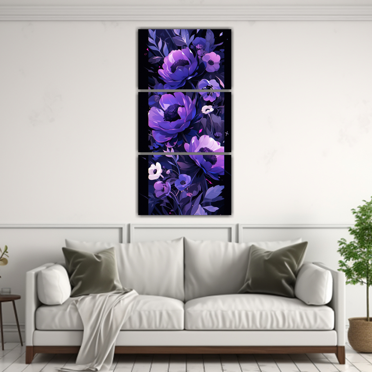 Este cuadro en púrpura y negro sería perfecto para colocar en la sala de estar sobre un sofá gris oscuro, creando un contraste elegante y moderno Combínalo con cojines en tonos rosados y turquesas para darle un toque de color al ambiente