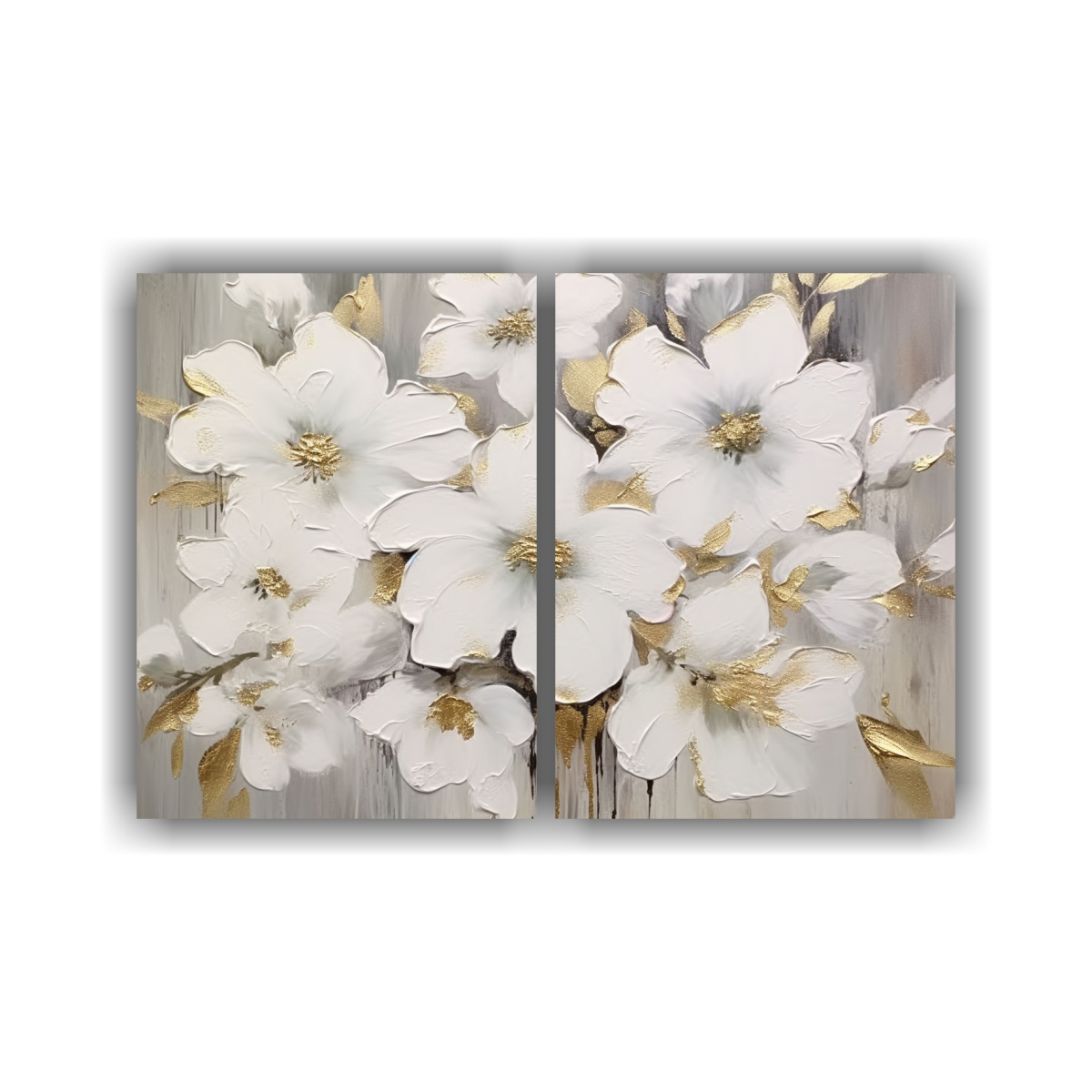 Este cuadro surrealista de flores blancas en blanco y dorado se vería espectacular en el dormitorio principal, sobre el cabecero de la cama, creando un ambiente armonioso y relajante Combínalo con muebles en tonos neutros para resaltar su belleza y darle un toque de modernidad a la habitación