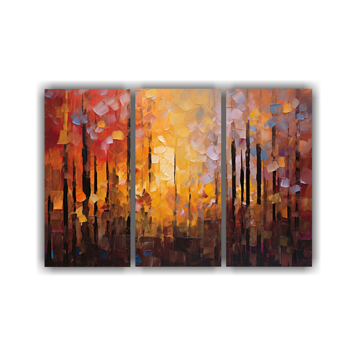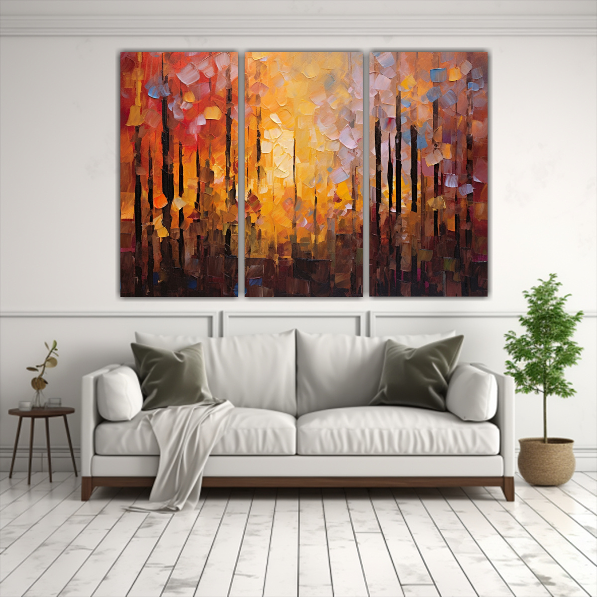 Este conjunto de cuadros se vería espectacular en una sala de estar de estilo moderno o contemporáneo Colócalos juntos en una pared principal para crear un impacto visual único y sofisticado Combínalos con muebles neutros para resaltar los colores vibrantes de las pinturas