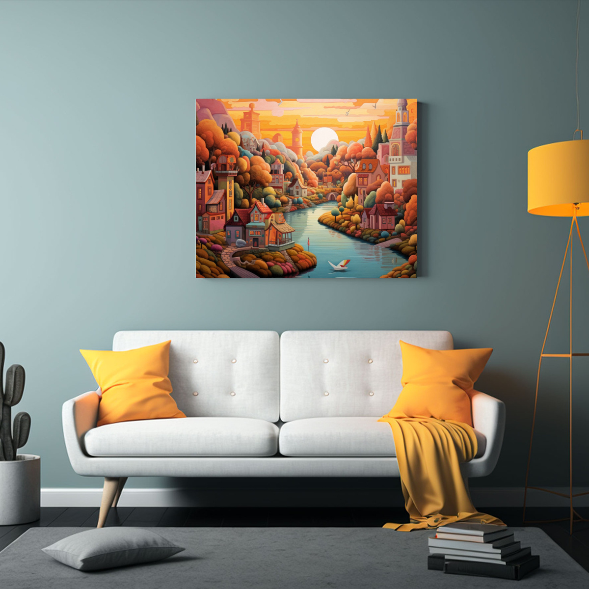 Este cuadro quedaría perfecto en el salón junto a una lámpara de pie para resaltar los tonos cálidos y transmitir la tranquilidad de un amanecer en un pequeño pueblo Complementa con muebles en tonos neutros para un ambiente acogedor