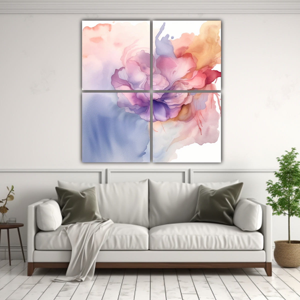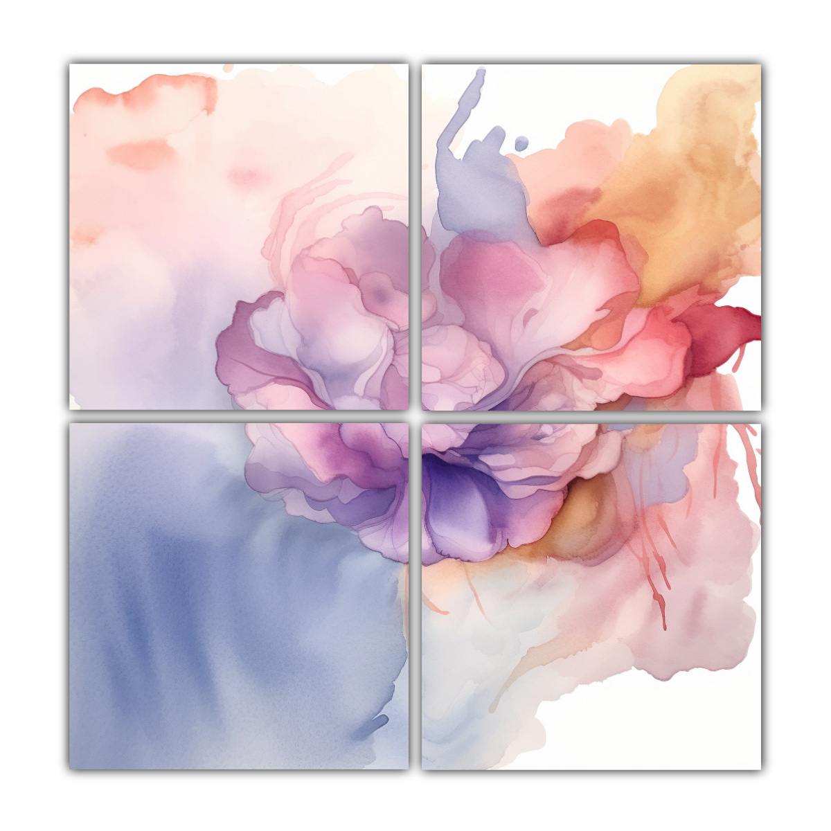 Descubre nuestras pinturas decorativas 4 lienzos en tonos acuarela suaves y etéreos Plateado, Gris, Lila, Coral y Beige